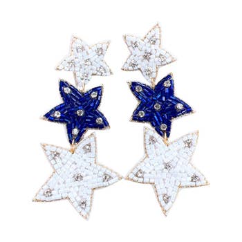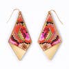 These statement half star earrings are made with Japanese Miyuki glass beads woven using 11 bead colors. Each earring is made with 3 separate diamonds which are then carefully woven together to create the half star shape. The earrings have a stainless steel post sewn on the back with nylon thread. These earrings are handmade by women artisans from vulnerable communities in Medellin, Colombia who receive fair working conditions and compensation for their skills. Materials: Miyuki Glass Beads Stainless Steel Post Size: Length 2 Inches Width 1.5 Inches *This style is available in several color ways. **The last photo is included to show our merchandising earring cards.