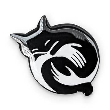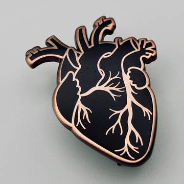 This 1.25" pin is made of iron with an antique brass finish and matte gold heart. Includes two black rubber clutches. Perfect for Halloween!