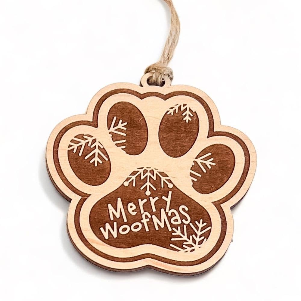 Custom Dog Paw Print Ornament - Add Your Logo Or Event to the Back. Choose "Happy Pawlidays" or "Merry Woofmas" & Personalize With Your Logo on the back. Perfect customer/client thank you gift for the holidays. Lightweight & Easy to Mail. This cute & rustic Dog Ornament is handmade and eco-friendly laser engraved onto sustainable wood. Perfect for pet stores, dog groomers, veterinarians, dog walkers, realtors + Send me your logo via email - hello@WildLarchCreative.com. ● Made from 1/8" thick eco-friendly sustainable maple wood ● Hangs from hand tied twine ● Each ornament will measure approximately 3" Eco-Friendly | Sustainable Wood If you have an idea and need a custom design - let me know! Please Note: Every laser engraved wood item is unique & products may vary from each other & from photos due to wood grain and color. Dog Ornament Unique Dog Ornament Christmas Dog Ornament Gift Custom Ornament Eco Friendly Shipping Christmas Ornaments Bulk
