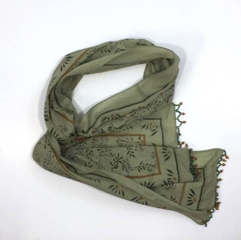 Hand block printed stole style scarf with tassels. Printed on organic cotton tissue voile in Sanganer just outside of Jaipur, India. Fair trade. We are guaranteed members of the World Fair Trade Organization (WFTO) and Craftmark in India. We make everything in-house and support artisan crafts. Size is approximately 28 x 78".