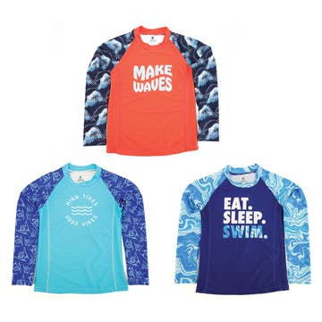 Bright, colorful swim shirts for kids! Infused with UV50+ protection, these fitted swim tees are great for limiting sun exposure and keeping out cold at waterparks, splash pads, swimming lessons, sports and sunny days at the beach. Reusable packaging is great for wet suits on the way home! -UV50+ sun protection -Slim fit design -Long sleeves for maximum coverage -18 piece assortment includes 3 styles -Three age-based sizes: S (6-7), M (8-10), L (12-14) -Reorder by style & size in 2 packs -Packaged in clear peggable zippered bag