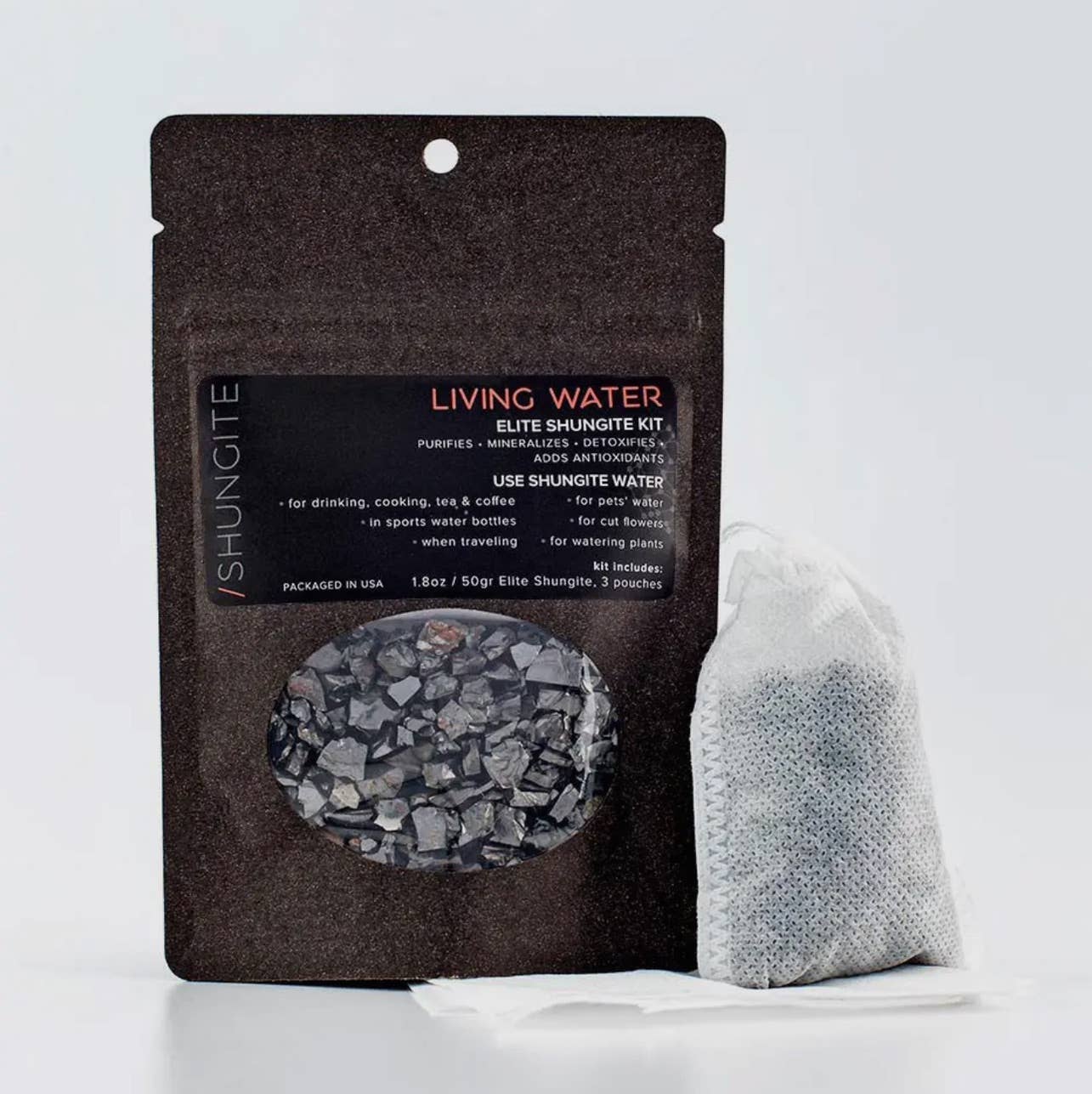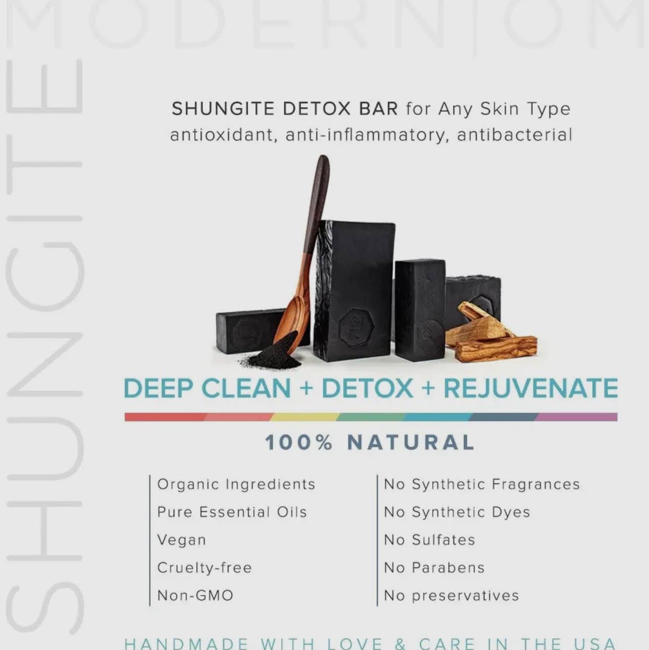Perfect for daily use, this finely balanced formula contains all-natural ingredients and no fillers. Purifying and anti-aging, Shungite is a potent disinfectant. Palo Santo essential oil has a very high concentration of limonene & α-terpineol terpenes - natural bioactive compounds that have strong anti-inflammatory and antiseptic properties to support healthy skin. Our unique and great-smelling Freedom No.8 essential oils blend will uplift your mood and balance your senses. Gentle and non-irritating, this bar nourishes and soothes the skin. Formulated for face & body, it has a light lather, rinses off clean (no residue) and leaves skin feeling soft and hydrated. full size 140gr (5oz) travel size 56gr (2oz) Learn more about SHUNGITE here and about SHUNGITE soaps here. JABÓN DETOX HECHO DE SHUNGITE: Perfecto para el uso diario, con ingredientes How to Use Lather with water, massage onto face & body, rinse thoroughly. Avoid contact with eyes.