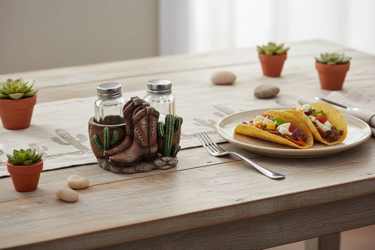 Vagabond House's Cowboy Boot Salt and Pepper Set is crafted in richly detailed pewter. Accurately embossed and charmingly detailed with spurs and buckles, this set is a perfect table accent for a western or ranch theme. Size: 3.5" T x 3" L Care: Hand wash recommended. If using dishwasher, choose lowest heat and non-acidic soap