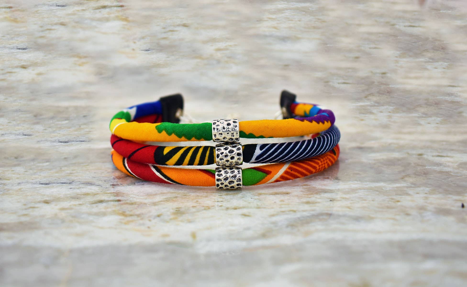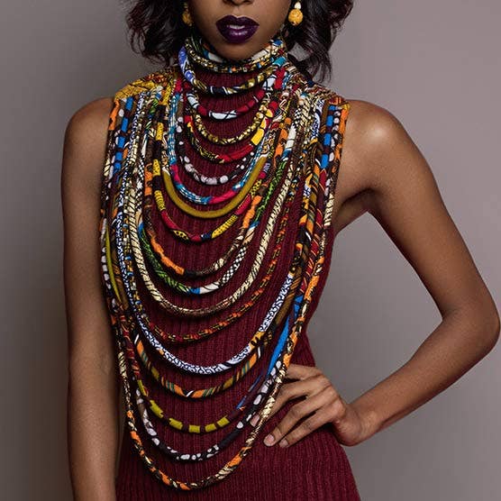 This African multi-color bib is a major fashion statement! It consists of two bibs combined as one. The handmade Sun Baule Brass Beads from Ghana are easily identified by the Adinkra sun and moon symbols. The wound globe beads throughout this piece are handmade individually through the "Lost Wax process" technique. The beads measure approximately 13-14mm in diameter. The small gold beads are also handmade, waxed, and are superior in quality. The extensive detail throughout this piece is what makes it a very intricate, detailed, statement conversation starter. * Measurement: 15" length, 7 1/2" width * Color: Multi-colored Brown, Tan, White, Maroon, Red, * Fabric: Faux mud cloth fabric * Closure: Bronze lobster closure - with 4 in. extension chain