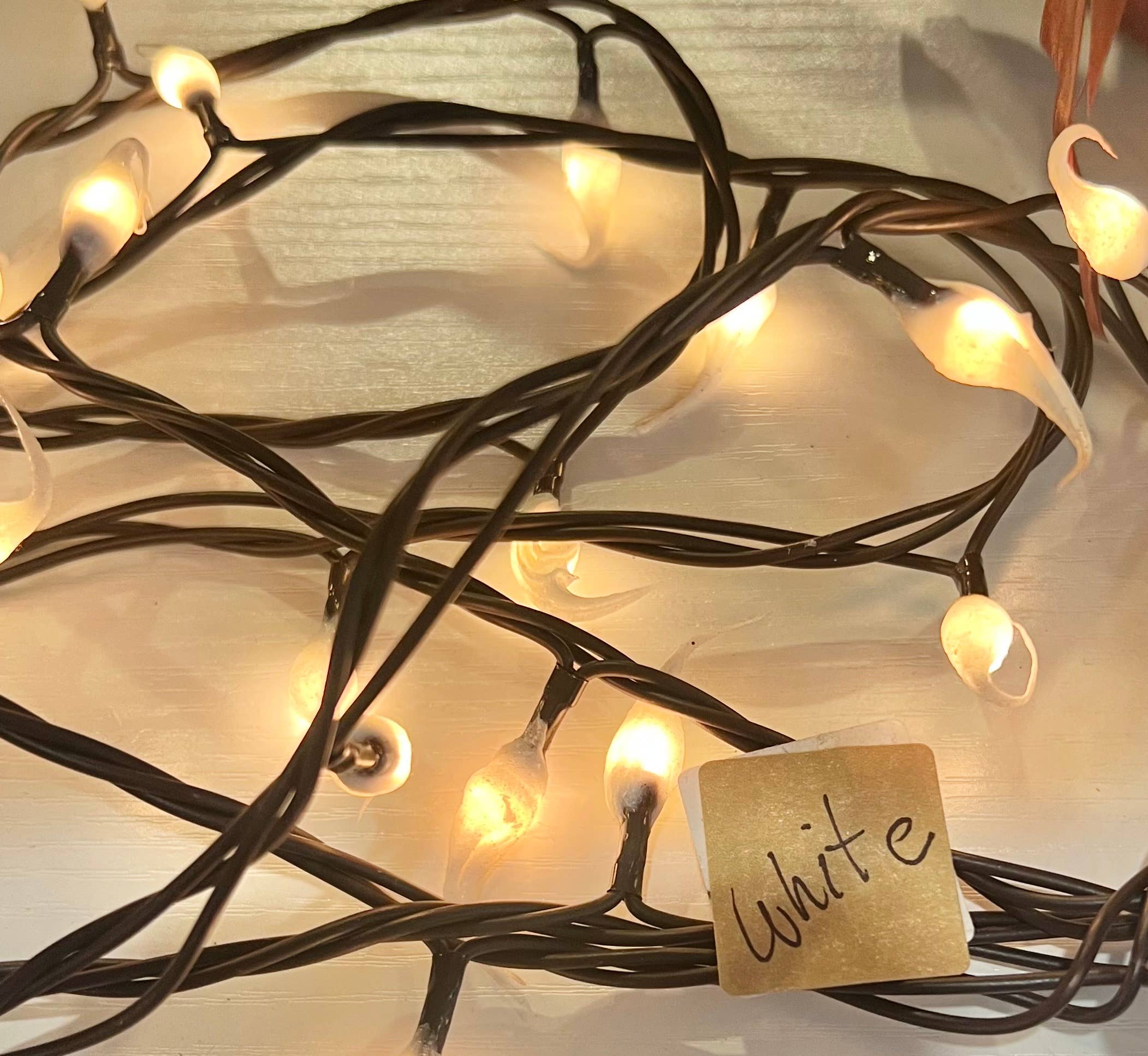 35 count brown wire strand of "wonder lights". Indoor/outdoor use. 134" long, 4" between each light. Warm white glow.