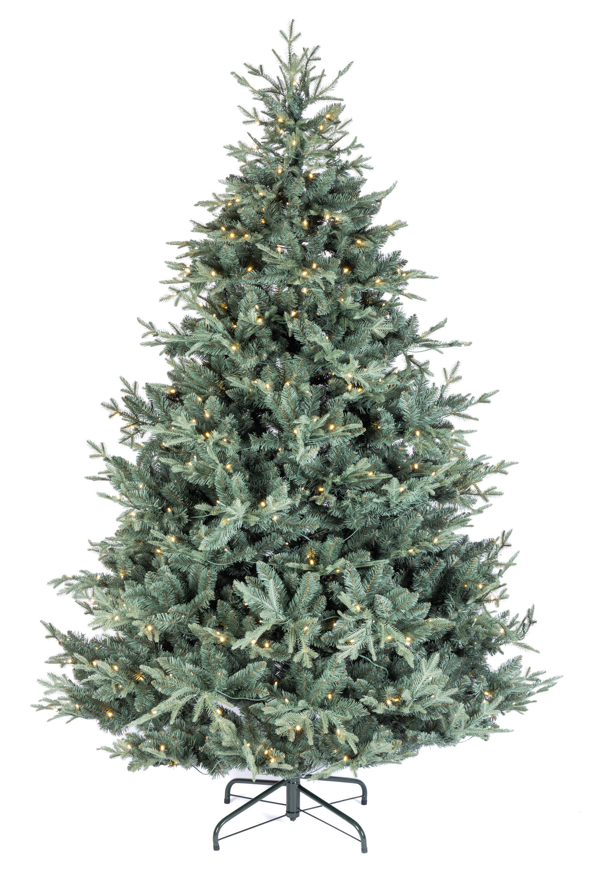 7.5'PRELIT WARM WHT CLUSTER LED BLUE SPRUCE TREE W/3494 POINT & ROUND TIPS (PE 1519), 3 SECTIONS, 2000/L LED 3MM LIGHTS W/UL ADAPTER, HINGED CONSTRUCTION & METAL FOLDING LEGS.