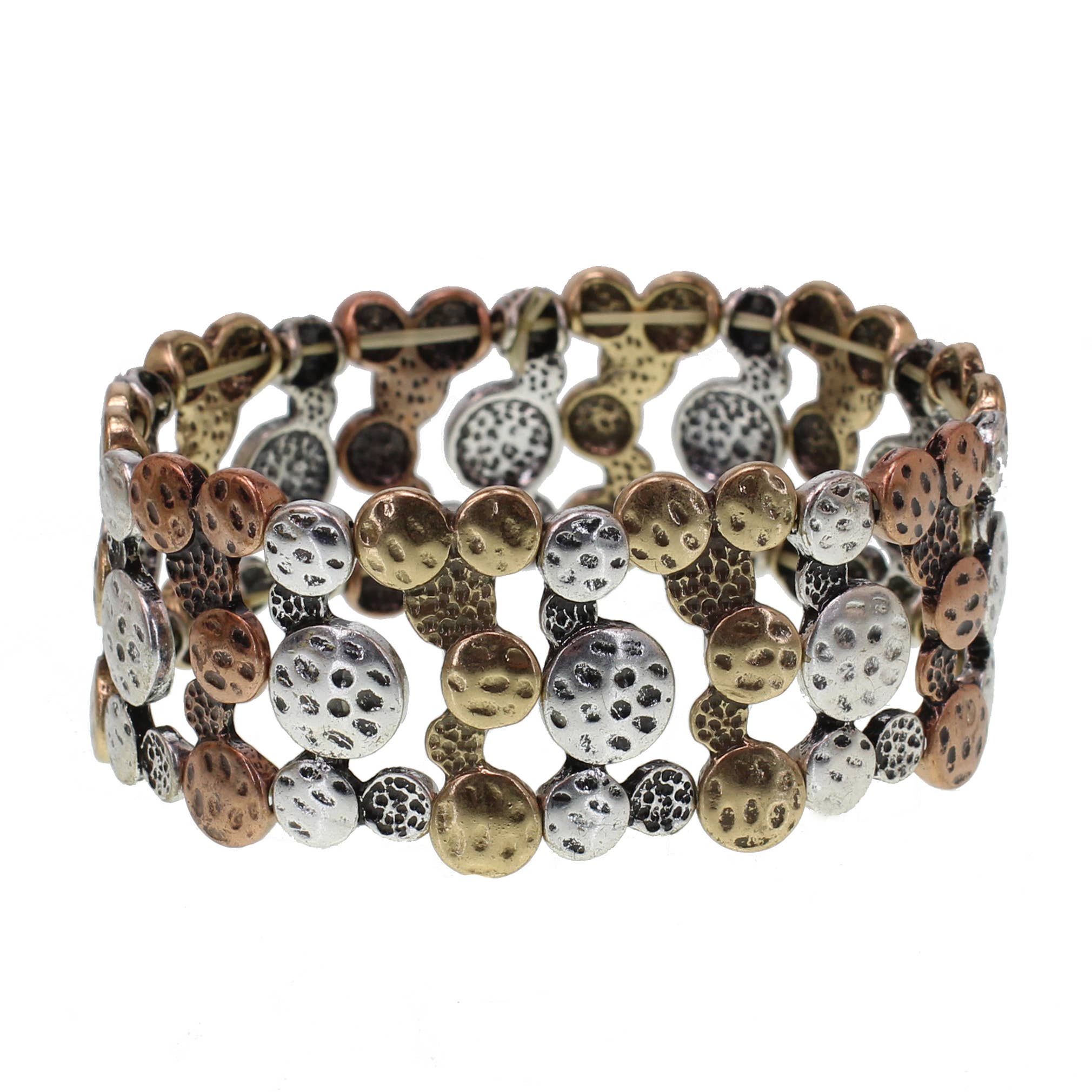 Engraved Hide Your Crazy with shotgun bullet shell and rope design. Vintage metal tri tone color western hand stranded beautiful bracelet. Available in silver, gold or patina colors. Lead and nickel compliant. Stretch to fit most size. About 3 x 2 inches. Approximately 1 ounces. Only from Lunar Deer.