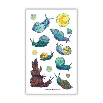 Each sticker design is hand painted by Katherine Mills-Yatsko. The watercolor snails are from a series of snail paintings created in conjunction with a performance work connecting pregnancy and postpartum to the lifestyle of snails. The purchase of a snail sticker helps to fund that evening length work. Sticker size is approx. 3” x 3” with some variation per design. Stickers are waterproof.