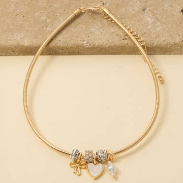 Offer your customers a touch of cosmic charm with this statement necklaceβa dazzling fusion of celestial icons and delicate florals, perfect for those who love whimsy with their shine. Designed to capture the magic of a starry night with a Y2K-inspired twist, this piece blends bold details with effortless elegance. Featuring a brilliant CZ star, a freshwater pearl, a CZ bow, and a carved mother-of-pearl flower, it combines dreamy textures with eye-catching sparkle. At its heart, a mother-of-pearl and CZ heart locket adds sentiment, complemented by a radiant CZ sun, a mother-of-pearl crescent moon, and a dangling CZ heart for the perfect celestial finish. Made to shine solo or layer effortlessly, this necklace is a mix of romance, playfulness, and nostalgia. A must-have for boutiques, it glows from daylight to starlight. * 14KT Gold Plated Brass * Genuine Cultured Freshwater Pearl and Mother of Pearl * Length: 16β³ plus 2β³ extender chain