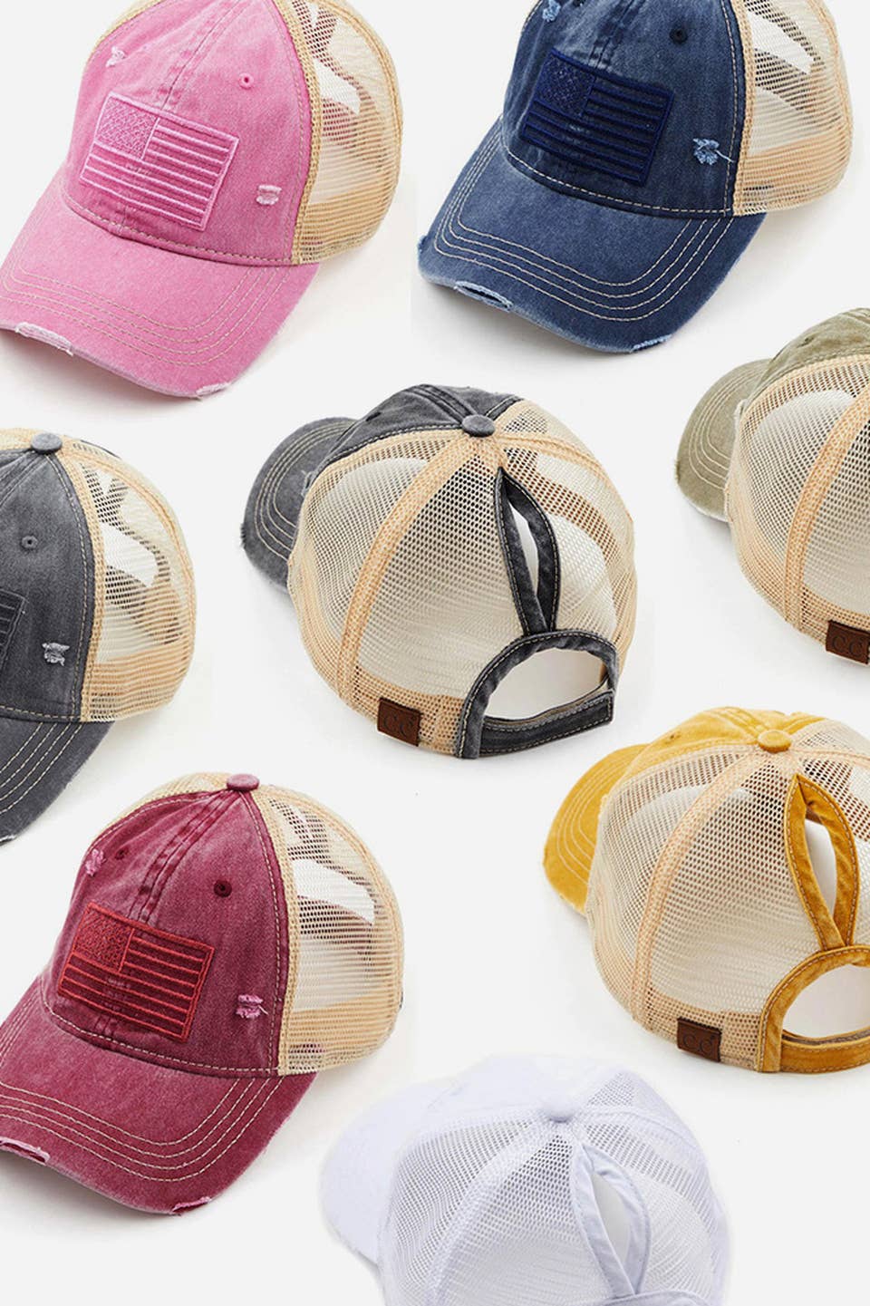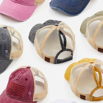 Distressed Mesh Back Pony Tail Cap Velcro Adjustable Closure-Tangle Free 20% Cotton 80% Polyester Made In China