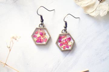Details: Total length of earrings are about 1.5 inches; Materials: resin,metal,flowers,copper flakes. These earrings are handmade with real pressed flowers encased in resin. Surrounded by a beautiful antiqued bronze hexagon shapes metal frame. Stainless steel backs, which are great for sensitive ears. Flower colors may vary. If you require specific colors, please contact us at the time you place your order.