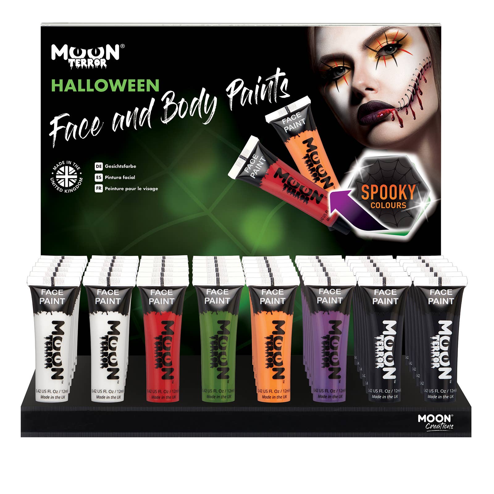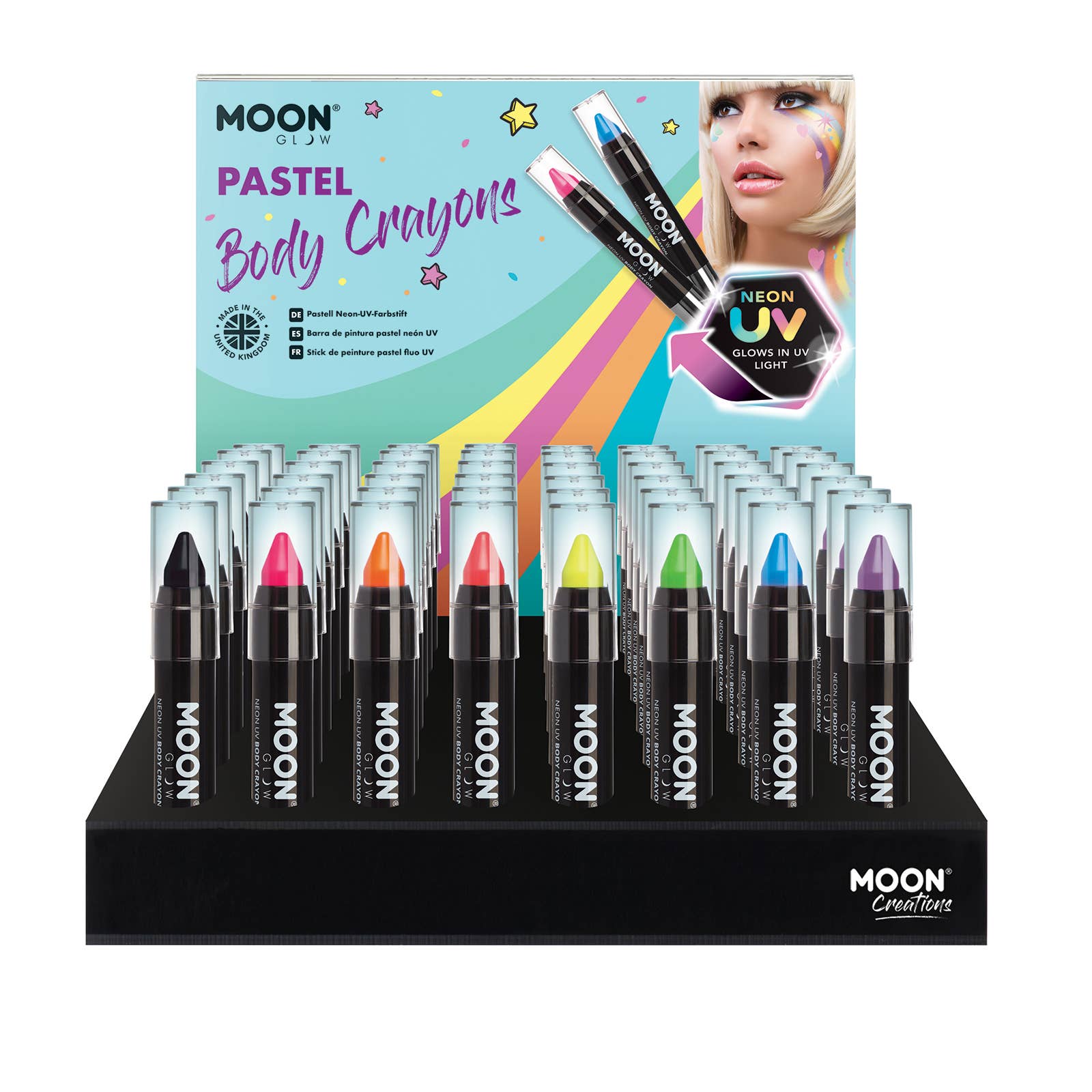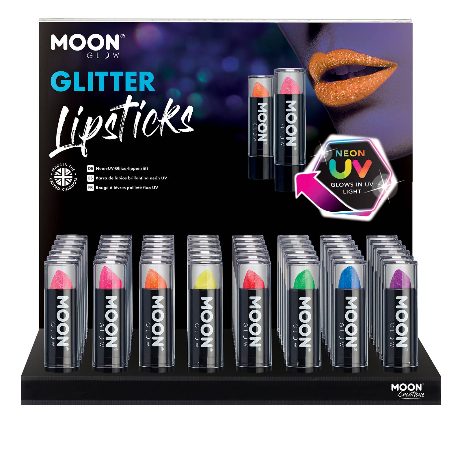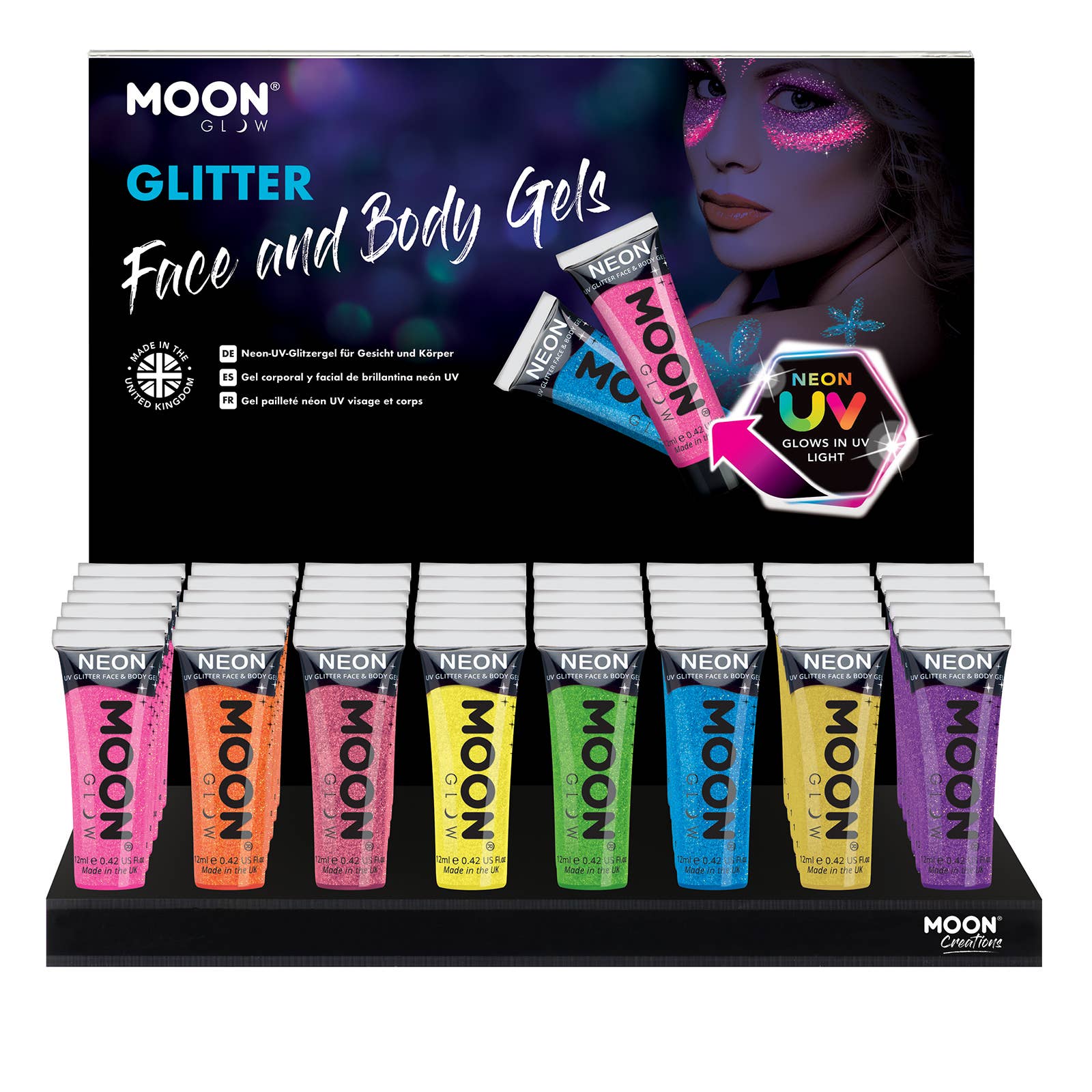 Includes 48 pieces of product and a custom acrylic display. Achieve stunning and dramatic effects on the face and body using our range of 8 vibrant colours of Moon Glow Neon UV Chunky Glitter Face & Body Gel! Sparkly neon gel in daylight that comes alive under UV lighting / Blacklights, producing a spectacular UV Glow. Ready to use in a tube format, our flake free and smudge resistant formula ensures your designs will last all night. Add more layers (once dry) to increase the glitter coverage. After use, simply remove with soap and water. ire Moon Creations collection is free from Fragrances, Parabens and SLS.