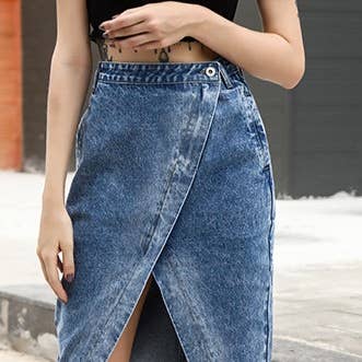 * Style No.: PD042558 Stitching Irregular Asymmetric Hem Large Denim A Line Skirt