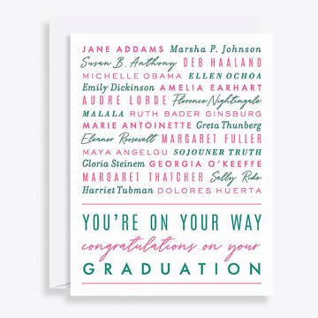 Celebrate their graduation with this charming vintage card featuring a determined graduate girl ready to conquer the world! With a cute mid century illustration and included envelope liner, it's a perfect way to send your congratulations and inspire them to embrace their future. Starburst design envelope liner Black Euro flap envelope included Made in the USA Wrapped in plastic sleeve for protection A2 (4.25 x 5.5) Made in the USA **NOTE: This card contains a dark black envelope. A self-stick label or paint marker pen is recommended for addressing.