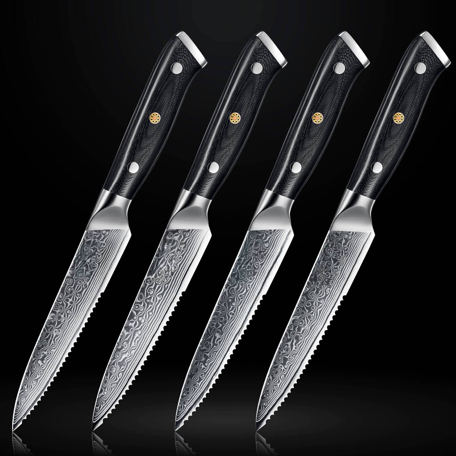 The pinnacle of knife-making, this 6-piece Damascus knife collection features individually forged Damascus kitchen knives made of 67-layer Japanese Damascus Steel with a HRC Rating of 63 for unparalleled hardiness and performance. 33-layers of Damascus on each side surround the Japanese VG10 Steel Core. Built to last and retain sharpness so that you will never need another set of knives again. Each knife has seamless welding from blade to handle. The handle itself is a G10 Full Body handle that confers a firm yet comfortable grip to make your chopping as effortless as possible. The knives boast a 15° cutting angle for superior cutting, as compared to a typical 25° edge angle found in most Western knives. You WILL feel the difference from the very first cut. *67-Layer Damascus Steel - For sturdiness and razor-sharp cutting. *Unique Ergonomic Handle Design - Looks and feels amazing in your hand. *RUTHLESSLY Sharp - Guaranteed to be the sharpest knives you've ever owned.