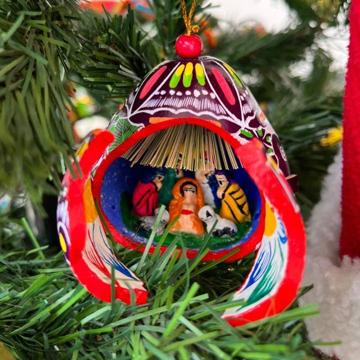 This year, the Vatican Nativity scene is from Peru, and we decided to create a whole collection of Nativity scenes (retablo). Hang your own in your Christmas Tree! 🎄 This Christmas gourd features 7 ceramic figurines in a Nativity scene, each one painted by hand and secured inside the hollowed out space of the gourd. The gourd ornament was hand carved, painted and polished by a family of artisans in Cochas, Peru. The interior is painted a midnight blue and white to recreate the sky, while the exterior is covered with stars. It took 3 days to the artisan to complete this art. Nativity gourd is available in Red, Orange, Green, Natural, Purple. All our gourds are biodegradable, when you consider that it’s time for its second life, please bury in the ground (including the wood Shaquira), it will help as fertilizer and nutrients for the soil.