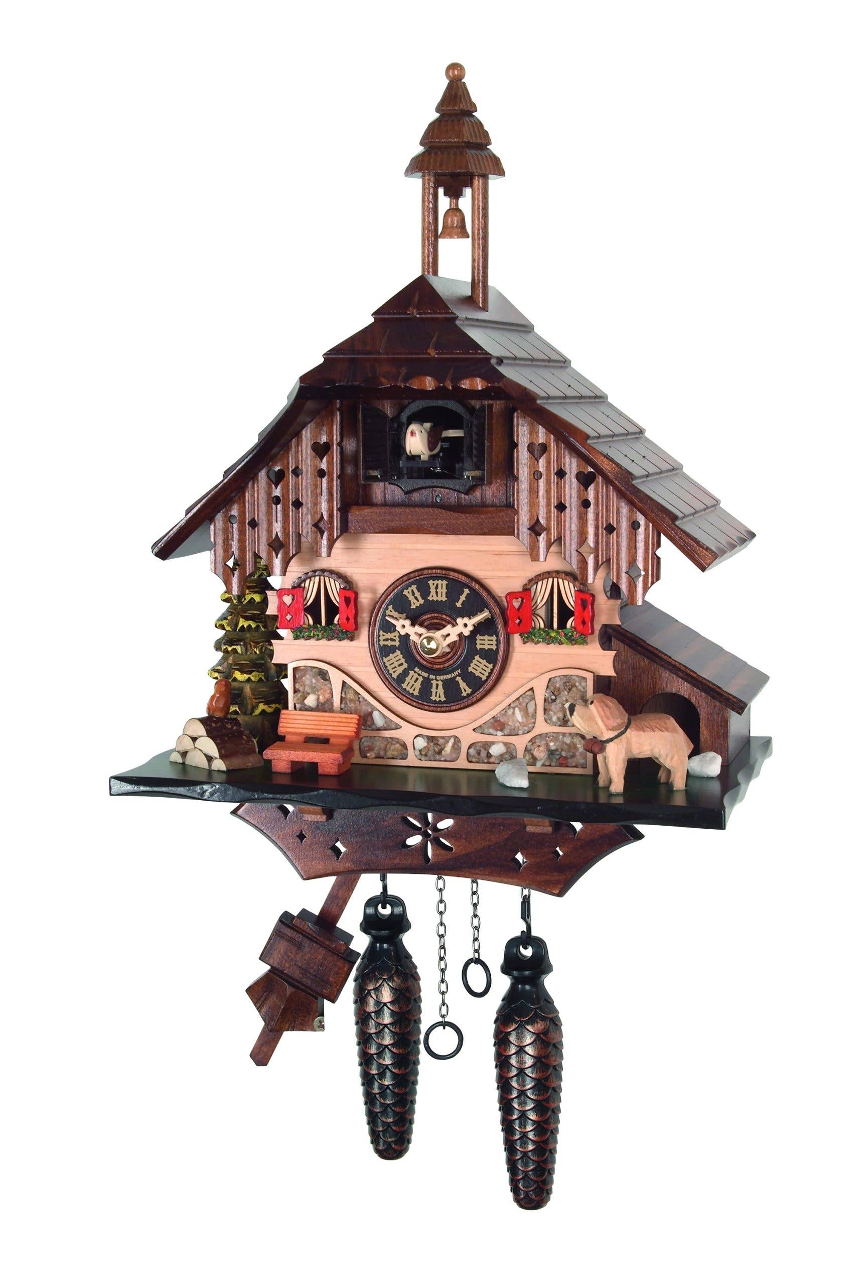 Adorable bears adorn this chalet style cuckoo clock making this model the nature lovers dream. The quartz movement plays melodies accompanied by the cuckoo call each hour. Made in Germany 12 Melodies and Cuckoo Call on the Hour Requires 3 C Batteries 9.5" x 9.5" x 6.5"