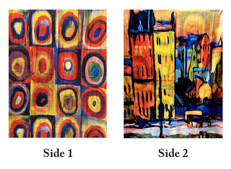 Gustav Klimt The Kiss (side 1) and Gustav Klimt Frieze (side 2) Artist Inspired Museum Print Pashmina Scarf with fringe. Double sided with 2 different prints. Stunning, beautiful vibrant colors. Can be worn as scarf or shawl. Size: 28"x79" - 3 pc min. Coordinating matching Glove # GLV-I357 (matches side 1).