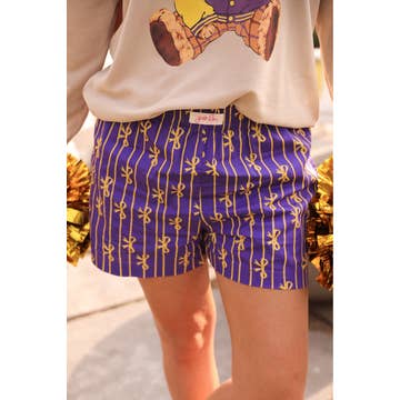 Meet your new game day MVPs. The Blitz Shorts are inspired by the rush of football and built for both stadium energy and everyday comfort. With a vintage acid-washed finish and a flattering dolphin cut, these shorts bring effortless style whether you’re cheering from the stands, tailgating, or running around campus. • Elastic waistband for a comfy, flexible fit • Acid-wash finish for that perfectly worn-in, game-ready vibe • Dolphin hem for a sporty, flattering silhouette • Each piece is one-of-a-kind—color and wash will vary, making your pair uniquely yours Fit: Total waist 26", inseam 1.75" (measured from size Small) Fabric: 60% Cotton, 40% Polyester