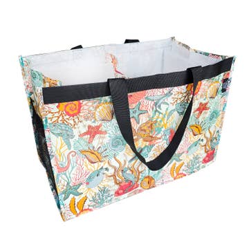 Recycled Feed Bag - Two Shoulder Straps 16” L x 4" W x 15" H Adorable new fish design (we just discovered this cute print)! Made from recycled plastic feed bags, this fair trade shopping tote is the ideal companion for the grocery store, farmer's market, or your favorite boutique. Say goodbye to single use plastic bags and carry your items in style! Water resistant and easy to clean, just hose and turn inside out to dry. Perfect For: Eco Friendly Gifts, Gifts for Travelers, Fair Trade Gifts, Recycled Beach Tote, Sustainable Gifting, Cute Travel Tote, Gifts for Students