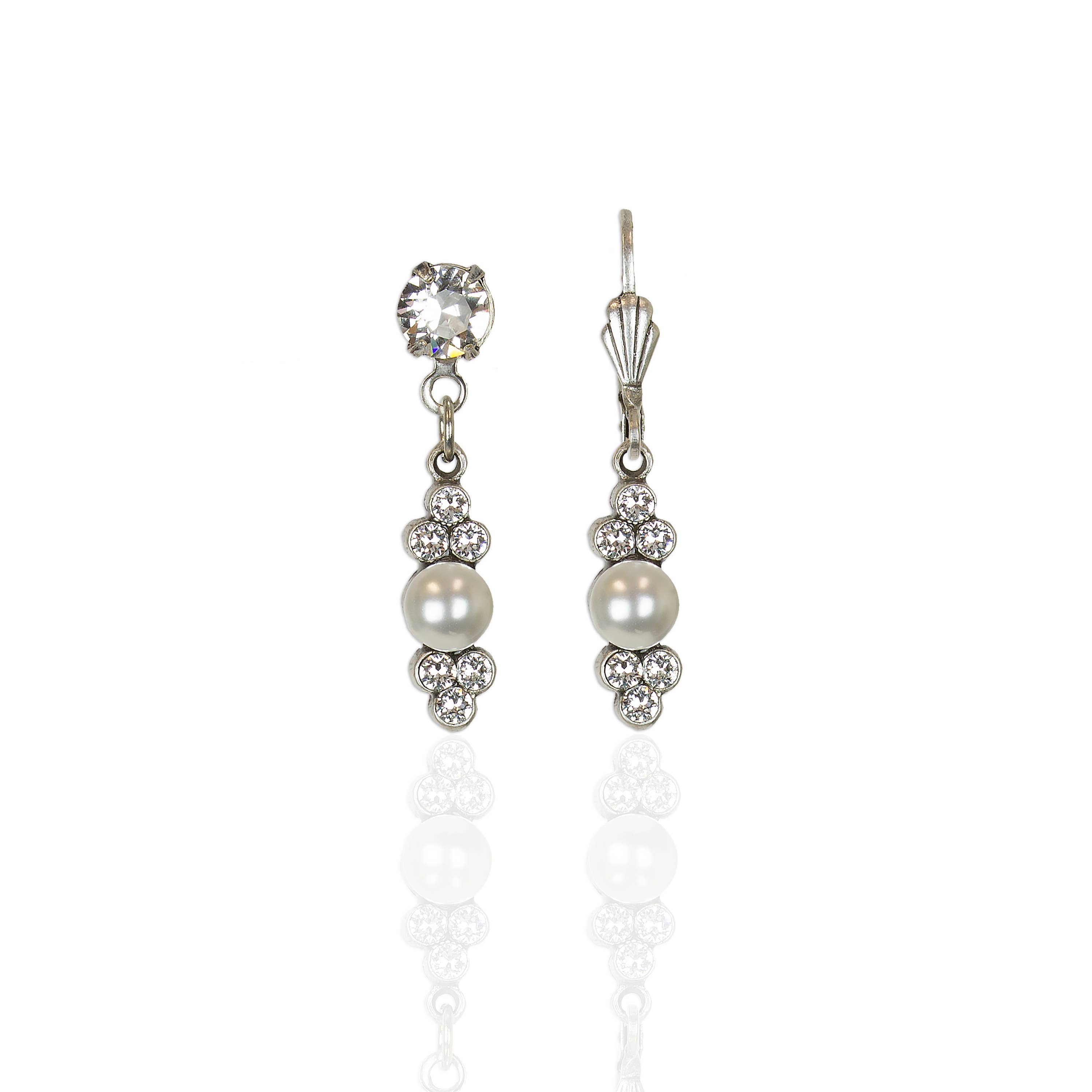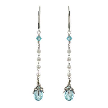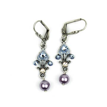 Complete your look with an icy sparkle in these little dangles. Featuring a hand enameled fleur-de-lis with crystal accents and pearl drop, these earrings glitter like the winter snow. Made in the USA with antiqued lead/nickel free silver plated white metal castings. Also available with a coordinating crystal clip or post. Earring wires/clips made of nickel/lead free antiqued silver plated brass. Posts made of surgical steel. Crystal Colors: icy blue, shimmering silvery crystal, metallic mauve faux pearl Enamel Color: icy blue gray Measures Approximately (from top of earring wire): 1 3/4"L x 1/2"W Style# ES3067BLS