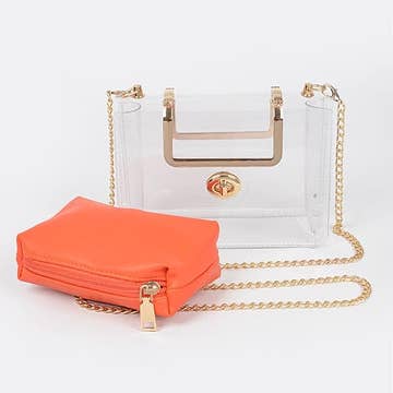 * Transparent Crossbody Bag * 4.25W*7H*1.75D * Pvc,Mixed Metal. * Transparent Crossbody Bag from H&D Accessories features a clear construction with a secure turn - lock closure. It comes with a metal chain strap for versatile carrying options, allowing it to be worn as a crossbody or shoulder bag. The compact yet functional design provides enough space for essentials like a phone, cards, and small cosmetics. Ideal for concerts, sports events, or casual outings where a clear bag is required, this crossbody bag combines practicality with a sleek, modern look.