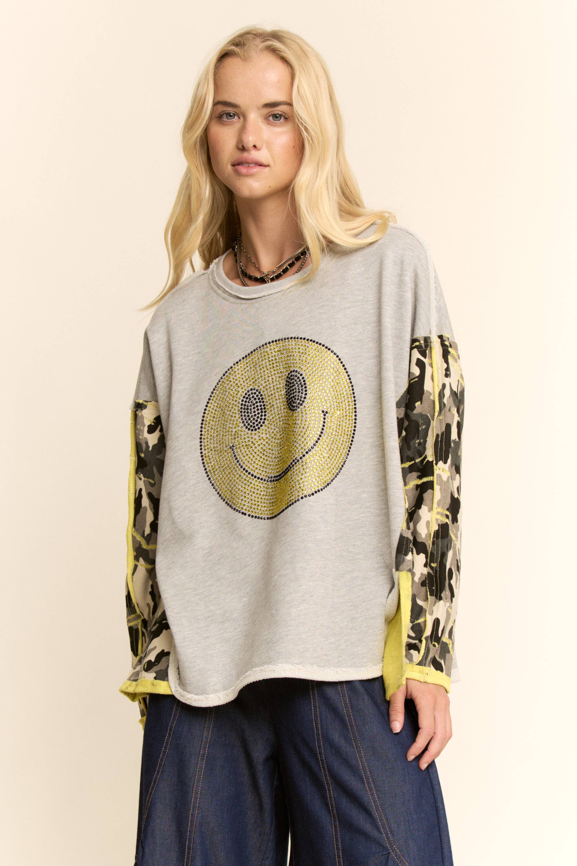 SHORT SLEEVE SMILE OVERSIZED KNIT TOP - ROUND NECKLINE - SHORTSLEEVES WITH DROP SHOULDER - BIG SMILE FACE DESIGN - IMPORTED -FABRIC 100% ACRYLIC SIZE PREPACK S/M-L/XL (3:3)