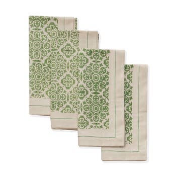Make every meal a celebration with 100% cotton block printed Green Bounty Cloth Napkins. Each napkin is one-of-a-kind because they are block printed by hand by artisans with Asha in India. Block printing is a heritage craft, a multi-step process that includes mixing natural dyes, sketching designs, then carving these intricate patterns into thick wood blocks, a separate block for each color in the design. This is all before the textile is woven, often by hand, washed, sun-dried, then prepped for printing. Which is done by the steadiest of hands, repeating the pattern over swaths of cloth draped over long tables. It’s an ancient technique carried on by artisans who handcraft these stunning one-of-a-kind pieces. When you hold one, you can feel the richness of its story and how it was made. Materials: 100% cotton - Measures: 20"SQ - Colors: Olive, off-white, gold - Care: Cold wash, gentle cycle. Tumble dry. Medium iron. - Handcrafted in India