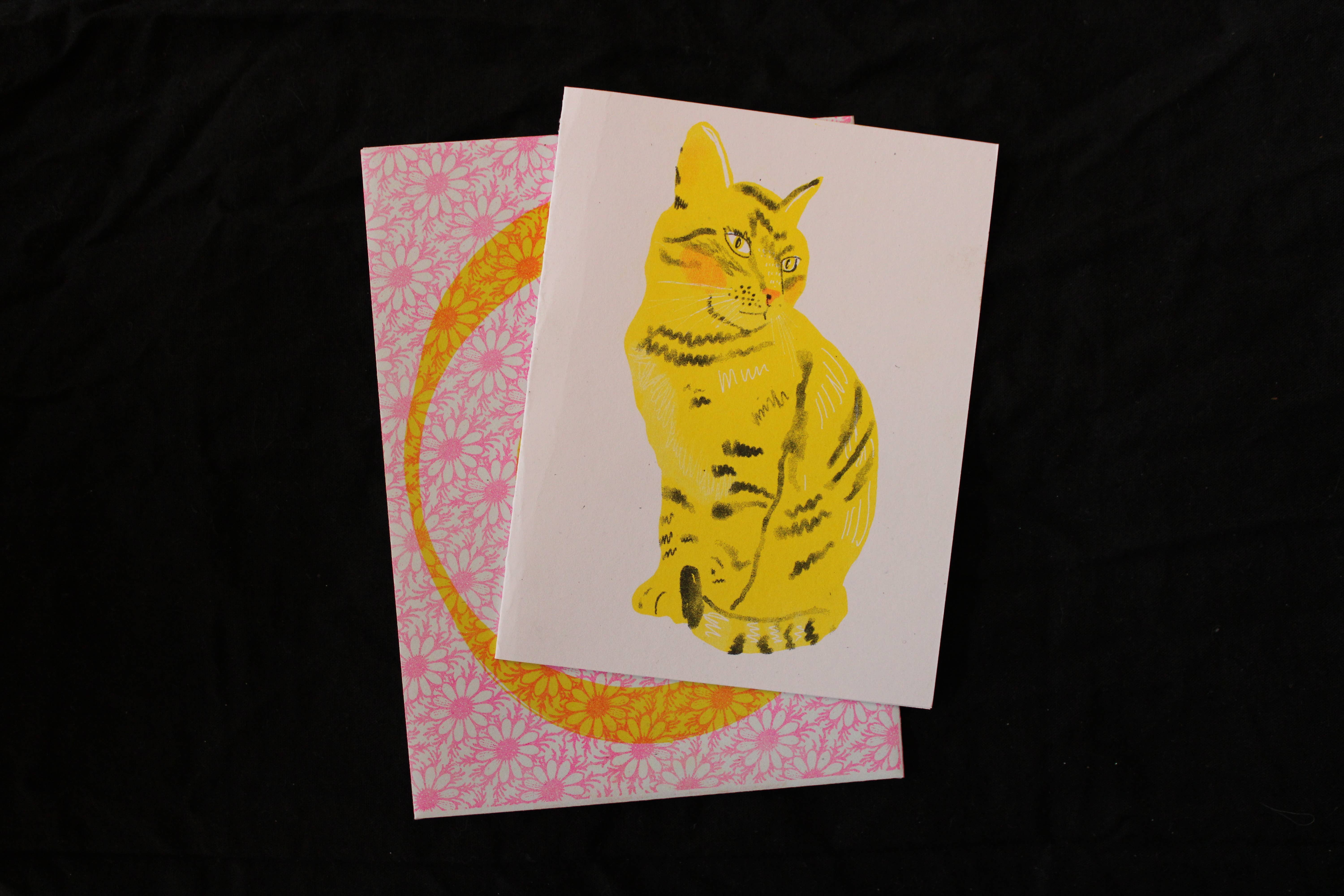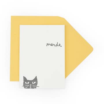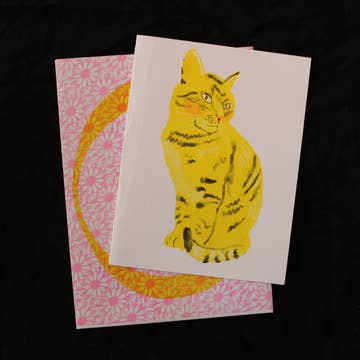 4.25" × 5.5" Letterpress Printed Greeting Card Brown Letterpress Ink on Yellow Paper Diecut Front Panel Matching Kraft Envelope Included Packaged in a Clear Plastic Bag It was only a matter of time…but the time is MEOW! Cats Out of the Bag Letterpress Greeting Cards are the perfect way to break the new, if they haven’t heard already… This card has been selected as a Louie Awards Finalist for 2026! Our team prints each page on a 1958 Original Heidelberg Letterpress. Since letterpress is a hand-done process, each card may vary from one another. © M.C. Pressure