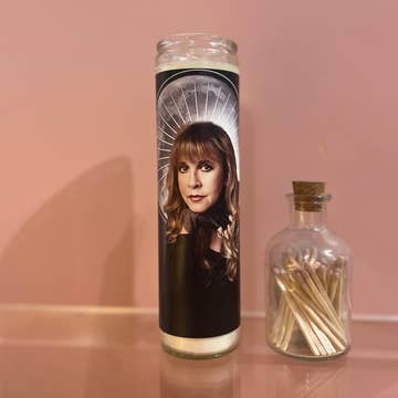 Tall white candle, hand poured in Mexico, design and assembled in the USA. Candle is unscented. Stevie Nicks inspired parody art prayer candle.