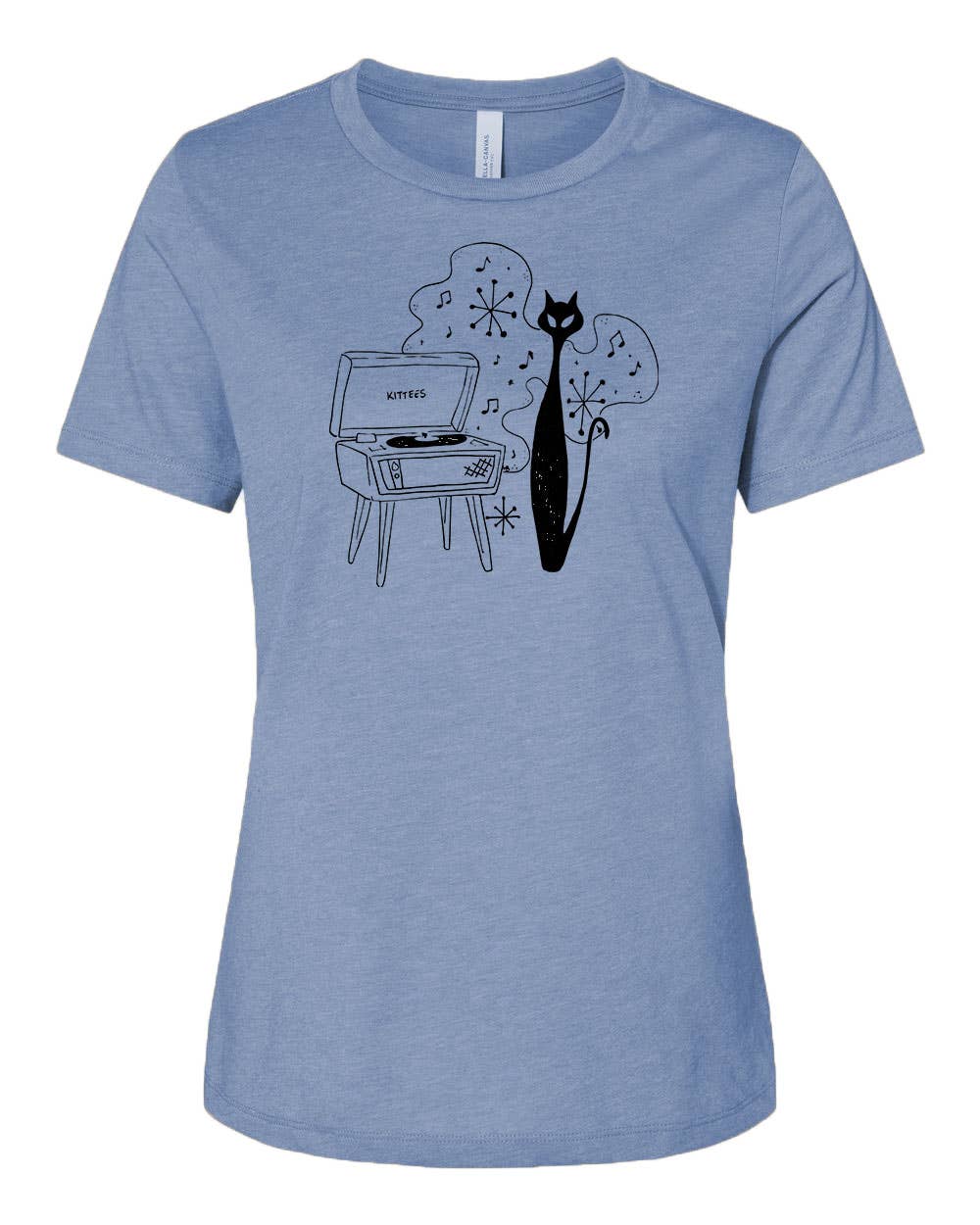 Super-soft triblend tee in Dusty Blue and Gray. Water-based ink. 3.8 oz, 50% polyester, 25% combed and ringspun cotton, 25% rayon blend.