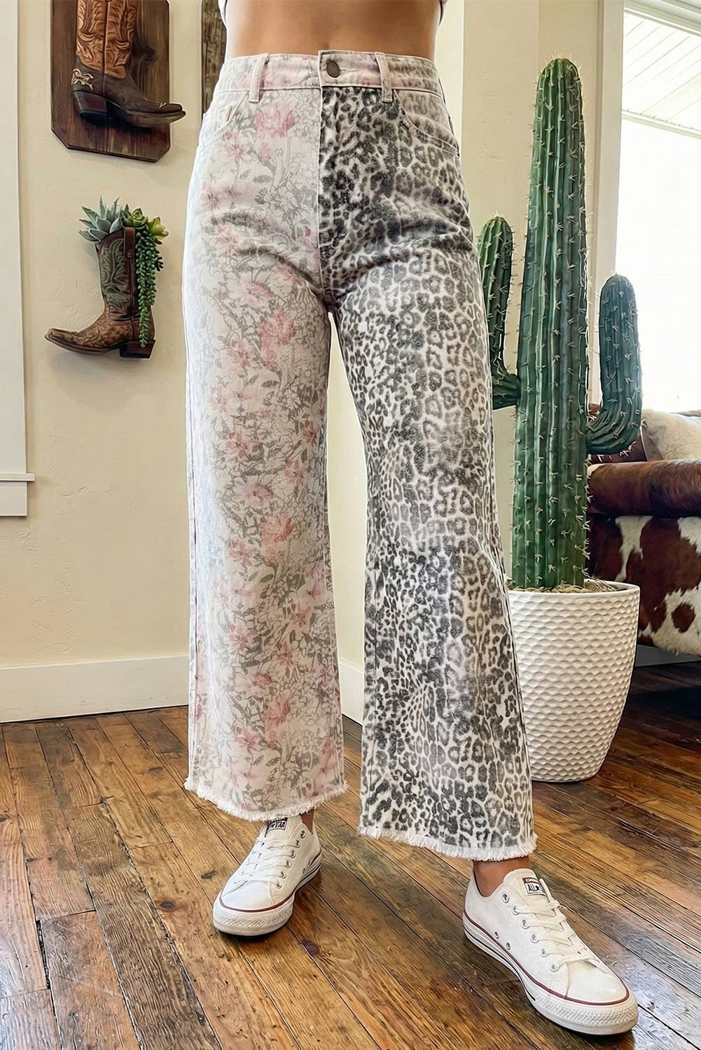 🌺Material: 65%Cotton+33%Polyester+2%Elastane 🌺Pattern: Leopard 🌺Waist Line: High Waist 🌺Details: Pocket Distinctive leopard print adds a trendy and wild touch to your outfit. High waist design accentuates your curves while providing a comfortable fit. Wide-leg style offers a modern and fashionable silhouette. Frayed edges give a stylishly distressed look for an edgy vibe.