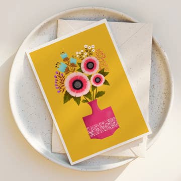 This greeting card features a red pincushion protea flower in a black and white polka dot mug resting on yellow vintage floral fabric. - Heavy white card stock - A2 size (5.5"X4.25") - Packaged with envelope inside clear plastic sleeve - Printed in USA - Blank inside - Card and envelope made from a mix of material from responsibly managed forests and other controlled sources