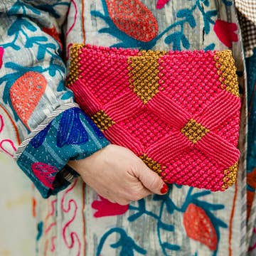 This beautifully handwoven macramé clutch blends texture, craftsmanship, and purpose. Featuring a rich pink and caramel diamond pattern, each clutch is meticulously crafted by women in Rahab's Rope stitching center, making every piece one of a kind. A soft, colorful fabric lining adds a joyful contrast, while the wristlet strap offers easy, on-the-go wear. Perfect for everyday essentials or special occasions, this clutch is both timeless and meaningful designed to elevate your look while supporting dignified employment. Details: Handwoven macramé exterior Colorful fabric lining Each piece is handmade; slight variations make every clutch unique Measurements (approximate) Width: 10" Height: 7" 19" removable chain strap • Warm golden brass finish • Lightweight and durable • Designed for hands-free wear Care Spot clean only. Lay flat to dry.