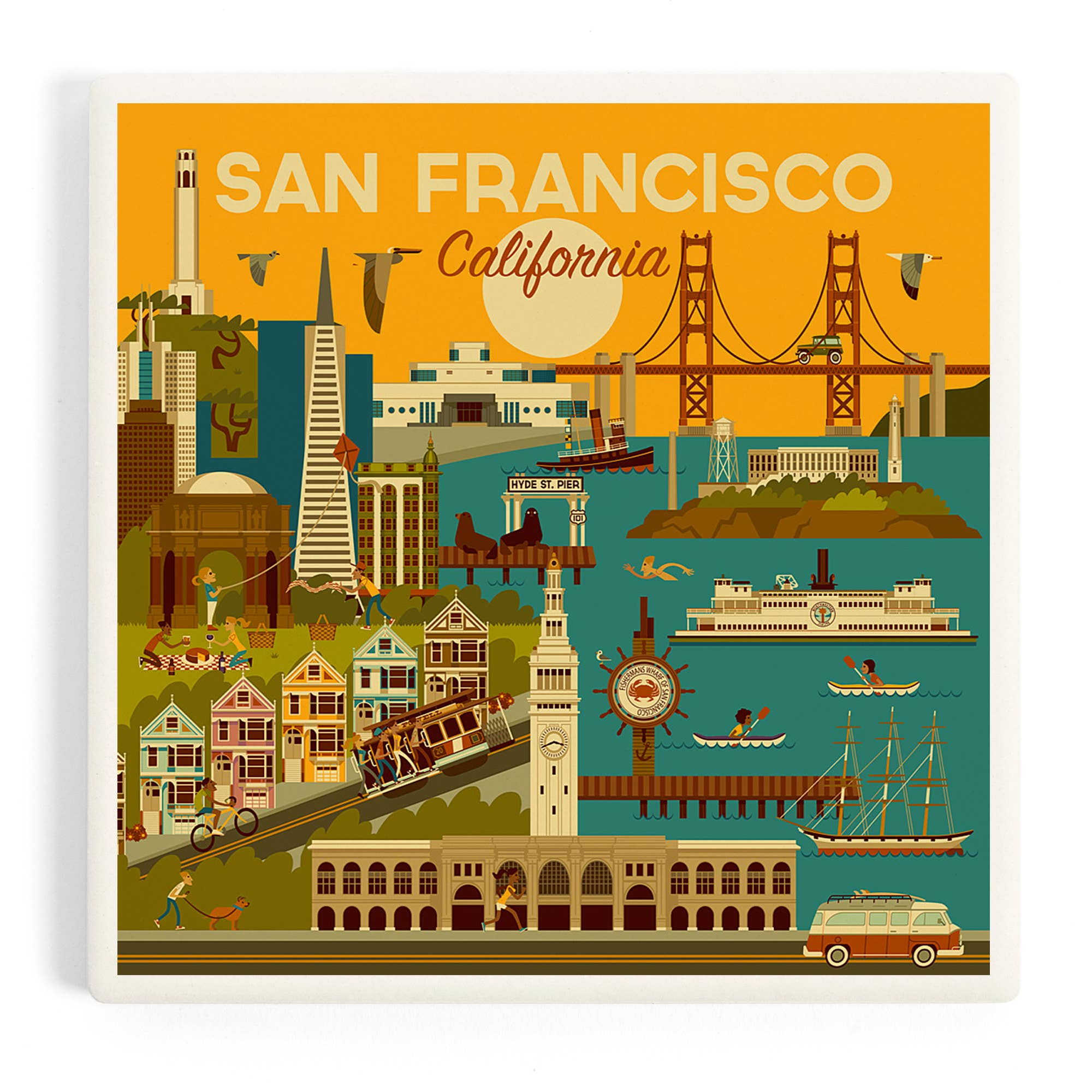 Our original iconic and neighborhood-specific photos and pics are dye-sublimated onto ceramic drink coasters and backed with protective cork. All of our handmade gift items are high quality, functional art pieces that capture our customers' memories. They make great housewarming, weddings gifts, and souvenirs. They are also great gifts for men and women. Clean with a damp cloth. Our tiles are 4.25" square. This image was taken in San Francisco, California.