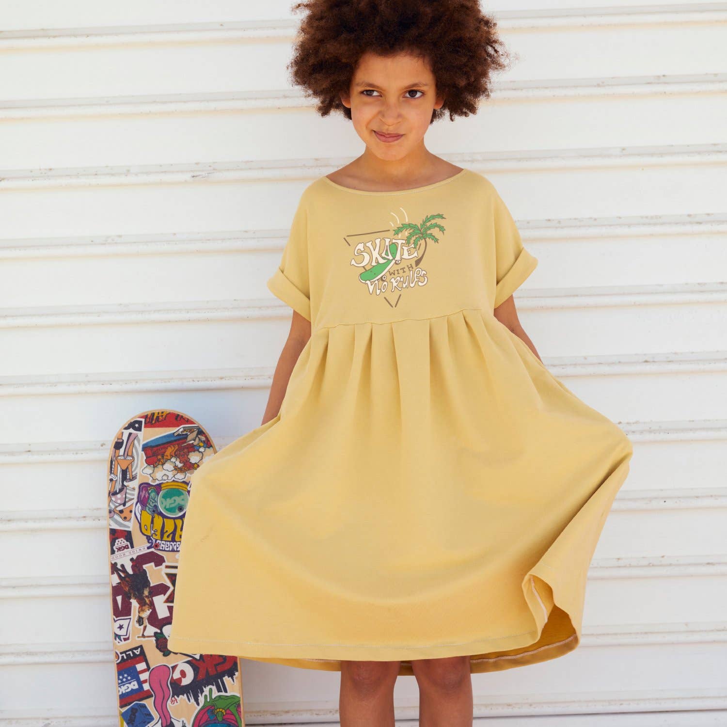 Girls love dresses AND dinosaurs. Does your child dream of Love of all things diplodocus, stegosaurus and T-rex? We’ve got you covered. Awaken the future paleontologist in your life with our dino dress. This dress is part of our GIRL REBEL collection of all terrain dresses for today's fearless, curious girls. - With real pockets - 100% organic cotton fleece - OEKO-TEX certified inks - Ethical manufacturing in Portugal - Super comfortable and practical to play - Stylish with original hand-drawn prints AVAILABLE FOR PRE-SALE NOW! DELIVERY IN DECEMBER 2021. Sizing Height (cm) Dress Length (C) Sleeve Length (B) 3-4 years 102 cm 55 cm 36 cm 5-6 years 115 cm 61 cm 40 cm 7-8 years 128 cm 67 cm 47 cm 9-10 years 140 cm 74 cm 52 cm 11-12 years 152 cm 81 cm 57 cm Details Composition: 100% Organic Cotton Fleece, Designed in France and produced (knitting, dying, printing and cut and sew) in Portugal.