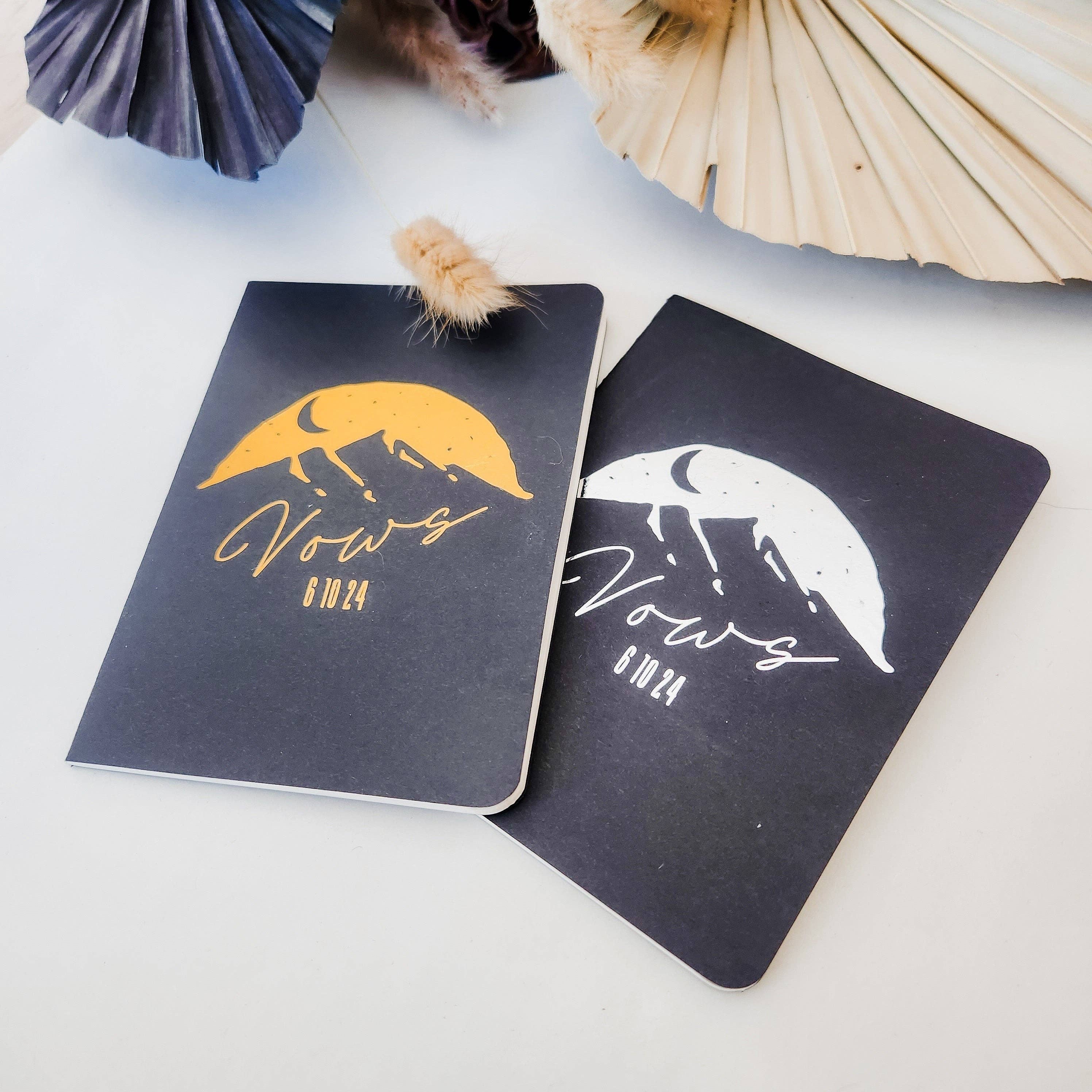 Two vow books with either gold, silver or white writing Perfect for the non-traditional and alternative wedding 4" x 5.5" black card stock cover and fits in your pocket foil options are gold or black 24 lined pages If you order gold vow books you will receive two gold books. If order silver you will receive to silver books. If white is ordered you will receive to white books.