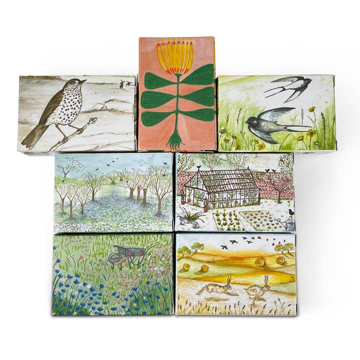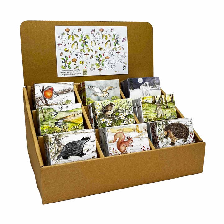 100g Natural Soap in Illustrated Boxes To complement our coastal-inspired illustrated range of candles and reed diffusers, Heaven Scent has launched a set of natural soaps individually encased in beautiful, contemporary boxes designed by Sarah Pettitt. Available in eight beautiful aromas, our new natural triple-milled, cold-pressed soaps are made in our solar-powered factory in the heart of Wiltshire. They are naturally coloured and infused with top-quality fragrance oils, contain no petroleum-based dyes, and the base contains responsibly sourced palm plant ingredients. With a typical pH of 10.5, our soaps are a pleasure to use. They create a soft lather, dry well without residue, and last long. These soaps are individually packed in printed boxes. Available in packs of 6 per aroma. They were suggested RRP: £4-£6. - Made in Britain. - Eco friendly - FCS Certified card packaging can be recycled Ship By Date: 2 Weeks