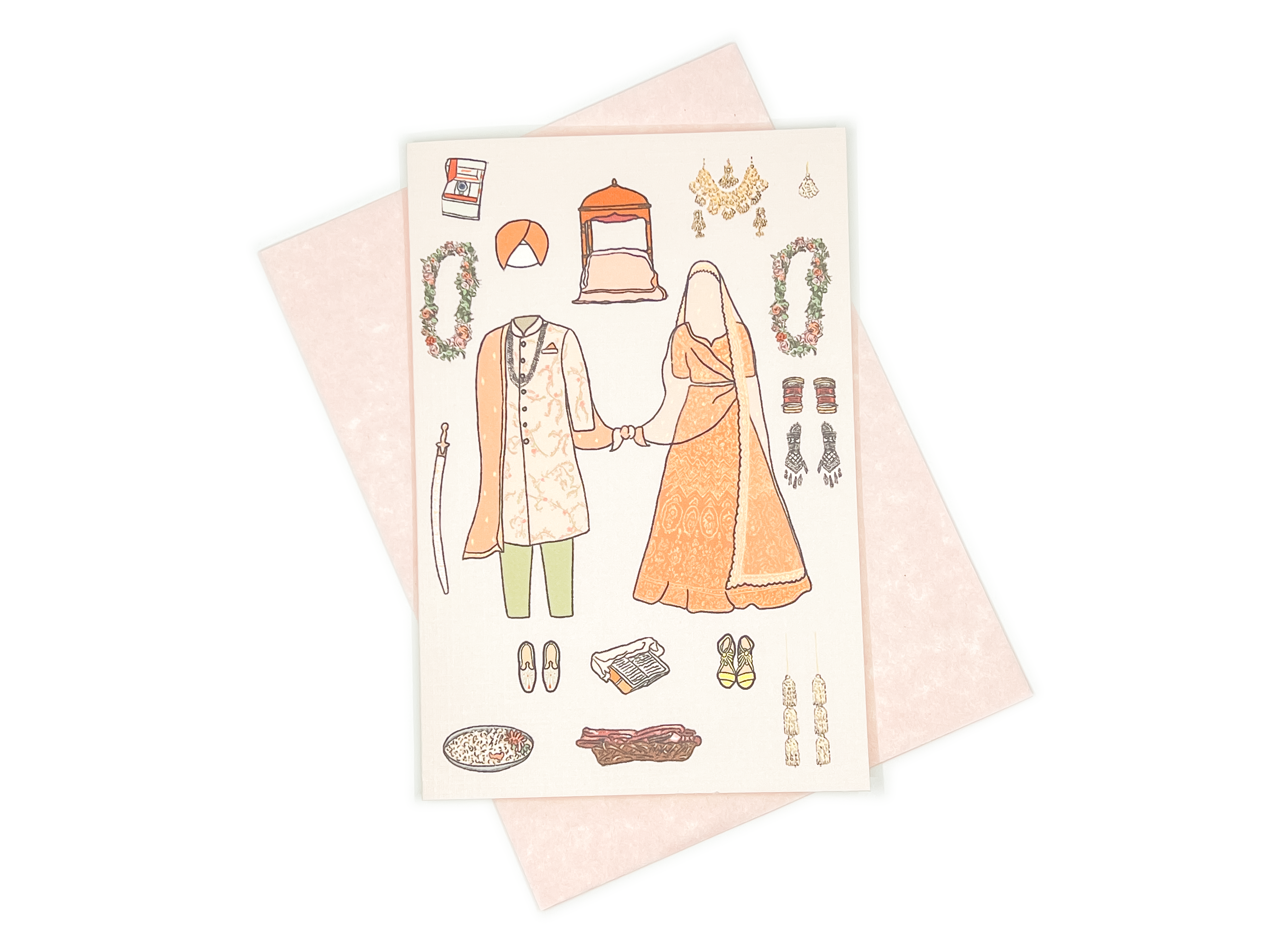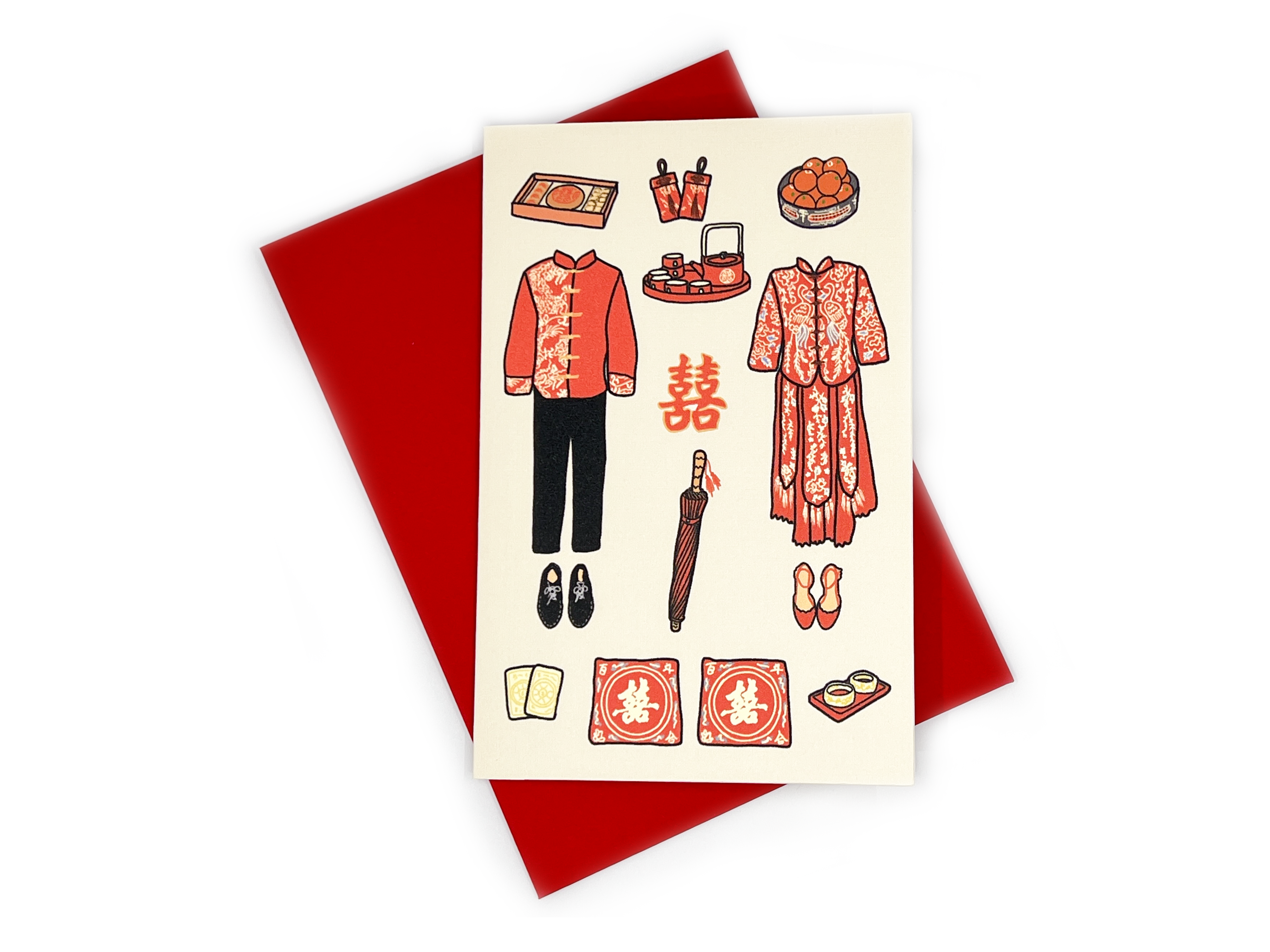 Wedding cards designed digitally and printed on premium heavyweight linen paper. Perfect for sending happy wishes to the newlyweds or for couples to send their wedding announcements. The inside of the card is blank and it comes with a red envelope to match. This item is part of a wedding collection and is inspired by Malaysian Indian culture. Overall dimensions: 4" (W) x 6" (H)
