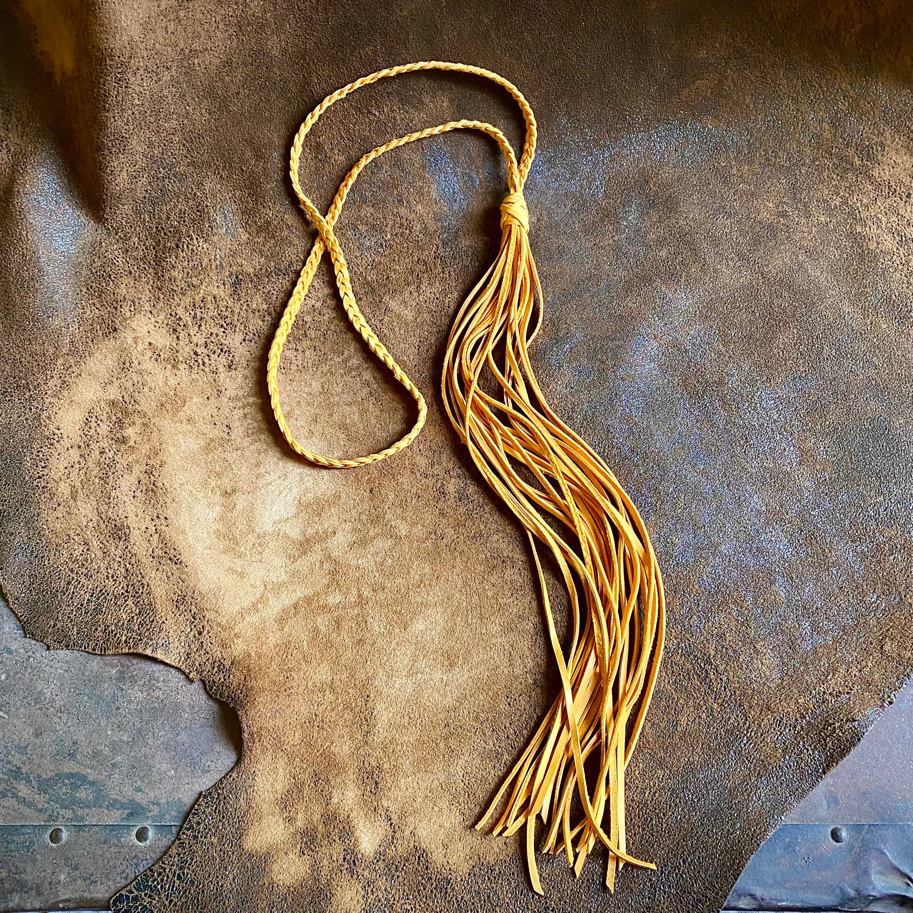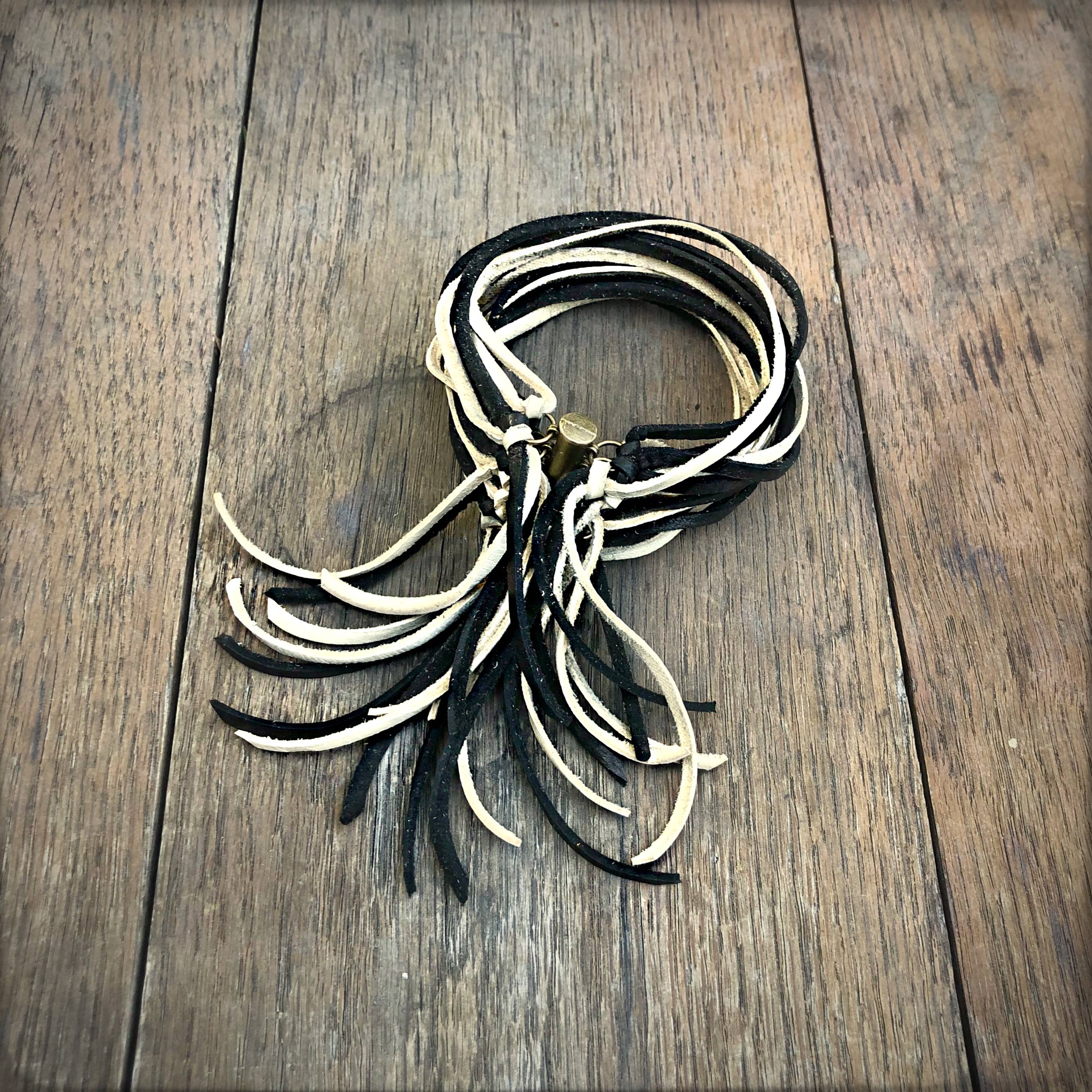A personal favorite of the designer, this badass cuff is so soft and comfortable, you won't want to take it off. 20 strands of black, chocolate, & rust color deerskin leather wrap around to an antique-brass magnetic sliding clasp.