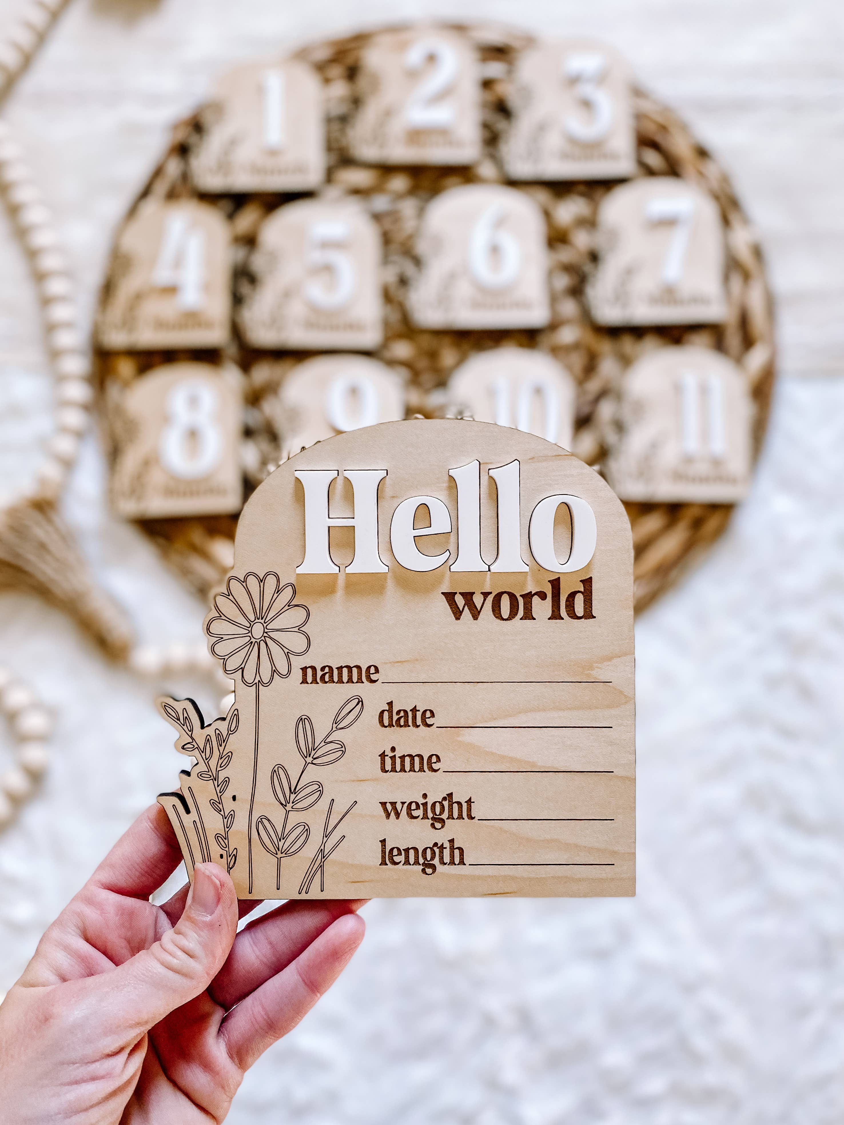 • Includes one Hello World Wooden Baby Welcome Sign, one marker for filling in your baby’s information • Attached sawtooth hanger for easy displaying anywhere in your home • Includes spaces for your baby’s name, birth date, weight and, height under the words “Hello World!” • Gray background and white font on rustic wooden background ensures this gender neutral baby photo prop will coordinate with any existing home or nursery decor • Perfect gender neutral baby gift to bring to your next baby shower • Dimensions: 12”H x 12”W x .25”D