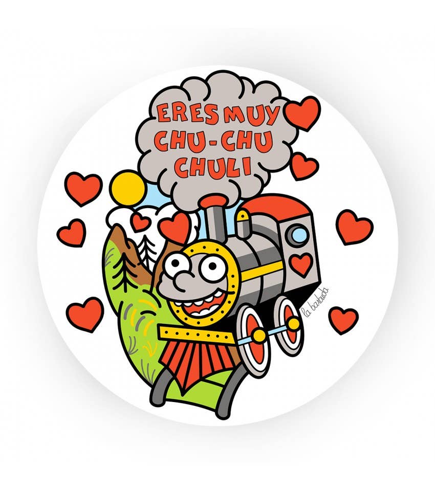 Indulge in pop culture with the Eres Muy Chu Chu Chuli Train Sticker from La Barbuda. This multicolored, 8 cm sticker is a perfect representation of the brand's love for comics, video games, and cinema. As an independent Spanish artist, La Barbuda creates designs for the tattooed retro gamers, cinema lovers, and cool people in general. This sticker is not just a product, it's a piece of art that brings a touch of retro charm to any surface it adorns. Express your love for pop culture with this vibrant sticker!
