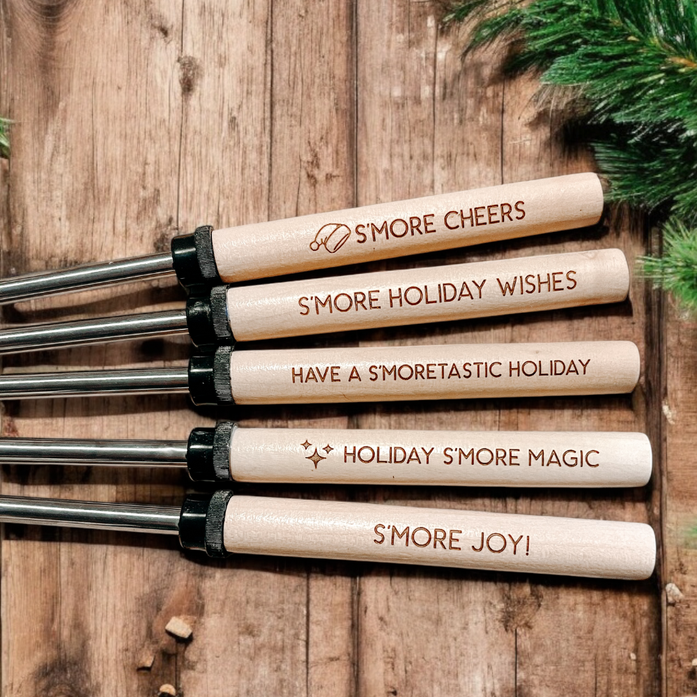 🔥Make Every Outdoor Gathering Unforgettable With Our Custom Laser Engraved S'Mores Sticks! These Durable S'Mores Roasting Sticks Are Perfect For Crafting Campfire Treats. Choose From 28 Ready-Made Friendship Puns Or Write Your Own. Designed For Campfire Cooking or Backyard Fire Pits, These Marshmallow Skewers Are Ideal For Marshmallow Roasting or Campfire Marshmallow Sessions. A hit for lodges, visitor centers, gift shops, campgrounds, weddings, retreats & corporate gifts, these custom souvenirs bring charm to any event. Whether you're creating classic campfire s'mores or enjoying delicious campfire food, these campfire sticks are a must-have for outdoor enthusiasts. Woman Owned - Not On Amazon - Eco-Friendly - Sustainable Note: - These S'More Sticks are not a toy. Do not leave children unsupervised with these S'More Sticks. - Because of natural wood variation, roasting sticks may differ slightly from photos - Text will be all caps w/ Sans Serif font unless otherwise instructed