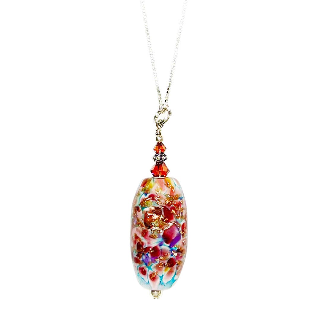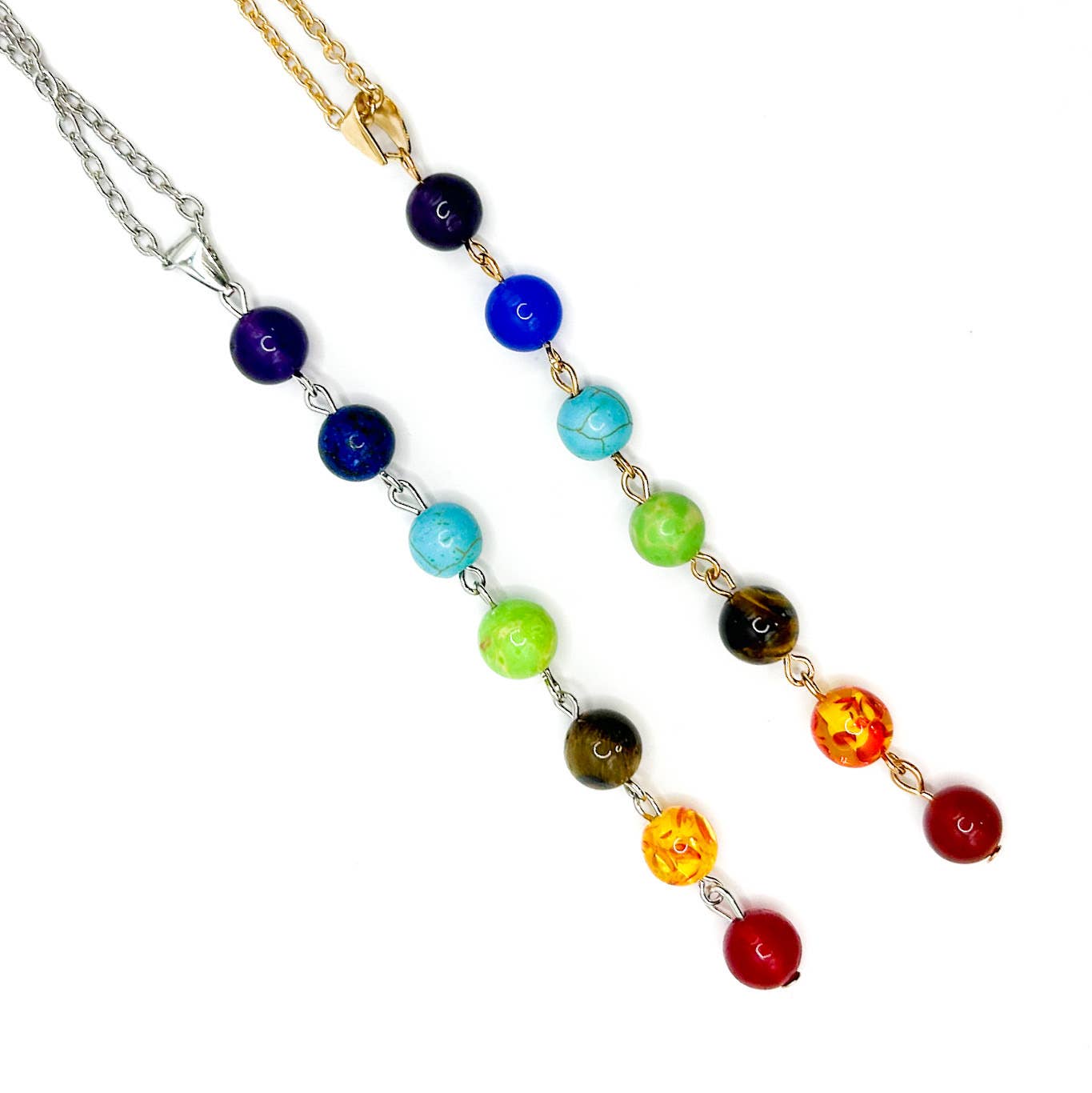 This necklace is made from different stones which has been cut and stacked on top of each other and polished into a pendulum shape. The stone hangs from a silver plated chain. The stones from the top: amethyst, lapis lazuli, blue aventurine, green aventurine, tiger eye, yellow aventurine, red jasper. The necklace is 18inches. If you would like a different length you can select to customize the product or you can send me a message with your preference.