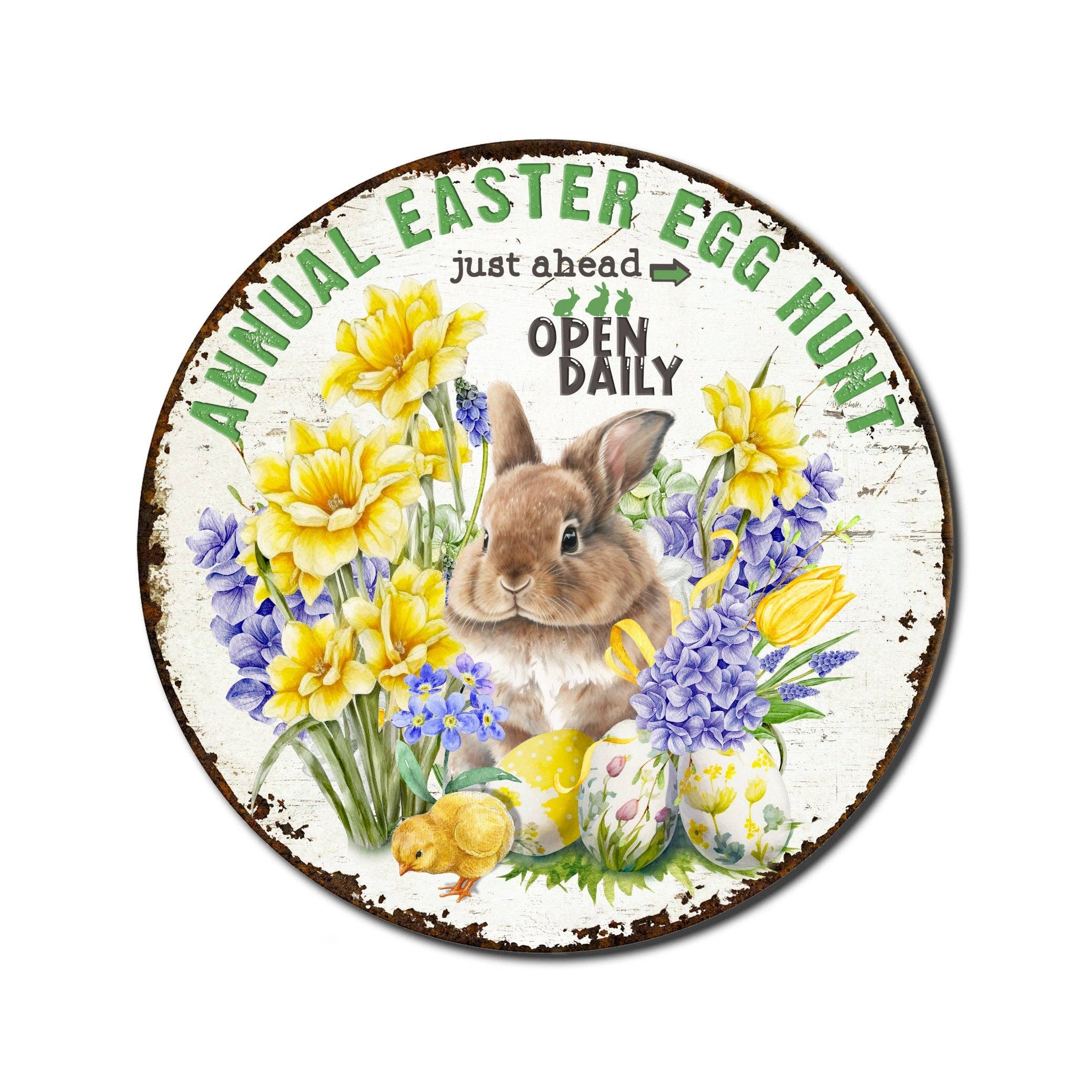 Arm yourself for an enthralling Easter with this Cottontail Farms Rabbit Feed Wreath Sign! Decorate your entryway with wreath signs, add-ons, decorations, accessories, and accents to whip up a whimsical space. Assemble this lightweight, robust sign swiftly to give your home a fabulous springtime makeover. Let the round door hanger spread its magic and flaunt your merry merriment with bunnies in abundance! Benefit from this one-of-a-kind Easter tin and sign - fostering a perfect blend of charming and stylish. AVAILABLE SIZES: 3”, 6”, 8”, 10”, and 11.75” FEATURES * Scratch resistant * UV resistant * Flame resistant * Anti-graffiti finish * Bendable * Anit-microbial * VOC free * Extended outdoor use * .025 aluminum * Exceptional detail * Archival quality * Easy to hang * Lightweight * Proudly printed in the USA HOW IT’S MADE Your item is printed using the latest heat transfer printing technology in order to produce vibrant colors, depth, and appeal that make our prints so beautiful. Your print is attached to the metal rounds, then heated in order to infuse the inks into the surface of the metal round, this gives the product longevity. Once the ink has been infused, and the product given time to properly cool, your item is then lovingly packed and ready to be picked up by the shipping carrier, and your Halloween tin is on the way to you. COLORS: This is a printed product, there are many variables that determine the color output for each print. One such variable is the color calibration of various screens, what looks to be very vibrant on our screen may look differently on yours. Due to this issue, the color on the item received may look differently than the item viewed on your screen. We will always do our best to ship the most vibrant and colorful product we can, just know that there is a possibility of color discrepancies. PERIMETER: Due to the nature of the product, we can only print within the confines of the given substrate. Meaning, if any area of the print protrudes past the edge of the substrate that part of the design will not print onto the final product. For instance, these designs are printed on round metal discs. Anything that protrudes past the circular background, will not be printed on the finished product. HOW IT’S PACKED We do our due diligence to make certain that each prints processed makes it to its new home in the same condition that it left in. As such, we make certain that your tin sign is packaged in such a way that it does not rattle around within the package, this could inadvertently cause damage. Smaller orders may ship via a Priority Mail Envelope, others larger orders, may ship via Priority Mail Boxes. QUESTIONS?
