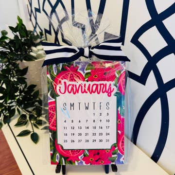 A mix of fun, colorful patterns and inspiring quotes from women are showcased each month of this 2026 Desk Calendar, including a full and new moon schedule. The desk calendar is made from thick, felt stock and is paired with a sturdy wooden mini easel. Desk Calendars are packaged in a clear plastic box measuring 4 7/8" x 13/16" x 6 5/8". The plastic box is made from 100% post-consumer recycled materials and is recyclable with a recycle symbol on the box. Please note: You may see some images that show 2023-2025 calendars. The 2026 calendar is up-to-date.