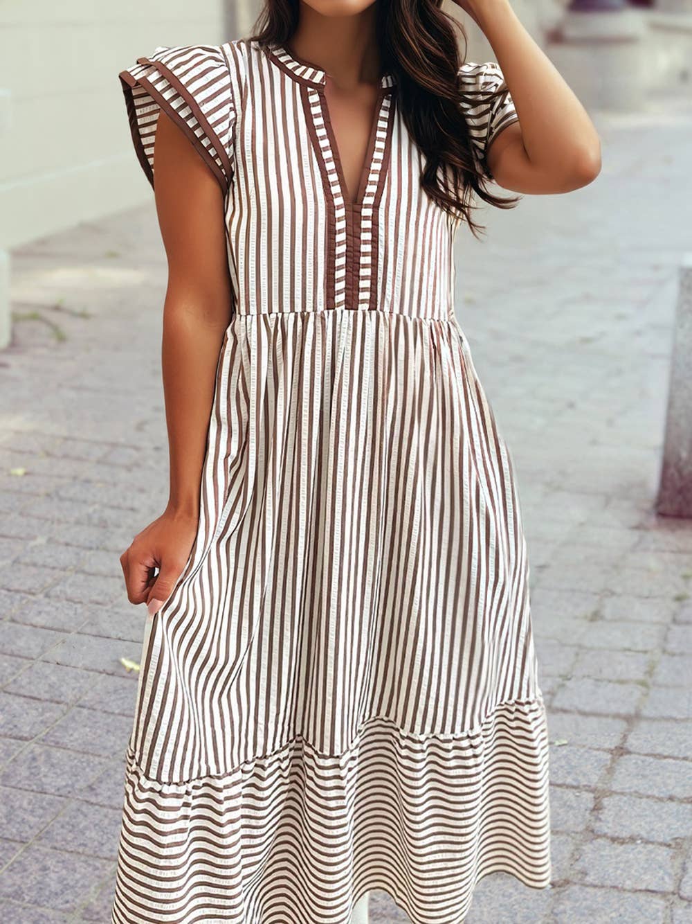 SKU: HWJ01729-Khaki-S Made in China Aesthetic: Casual Care Instructions: Hand wash Dress Style: Fit & Flare Fit: Contemporary Neckline: V-neck Occasion Theme: Everyday Occasion: Everyday Pattern: Striped Season: Spring/Summer Skirt & Dress Length: Mini Sleeve Length: Sleeveless Product Language: English Fabric: 95% polyester, 5% spandex Weight: 250 g (8.82 oz) Product Materials: Vegan Packaging: Reduced Production: Fair trade