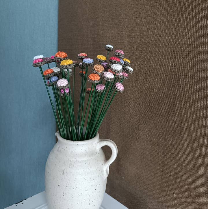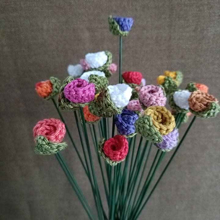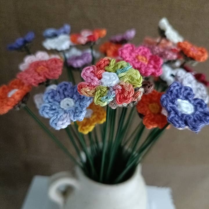 This charming crochet bouquet is a perfect addition to any space. With its small size and five hand-crocheted flowers, this bouquet exudes a unique charm. Each flower is carefully handmade, providing an artisanal look and adding a personal touch to your interior. The bouquet is stylishly wrapped, making it also a wonderful gift for friends, family or loved ones. Add a touch of homey warmth and creative flair to any room with this adorable crochet bouquet. Product may differ from the photo because it is handmade. All bouquets differ from each other and are carefully put together.