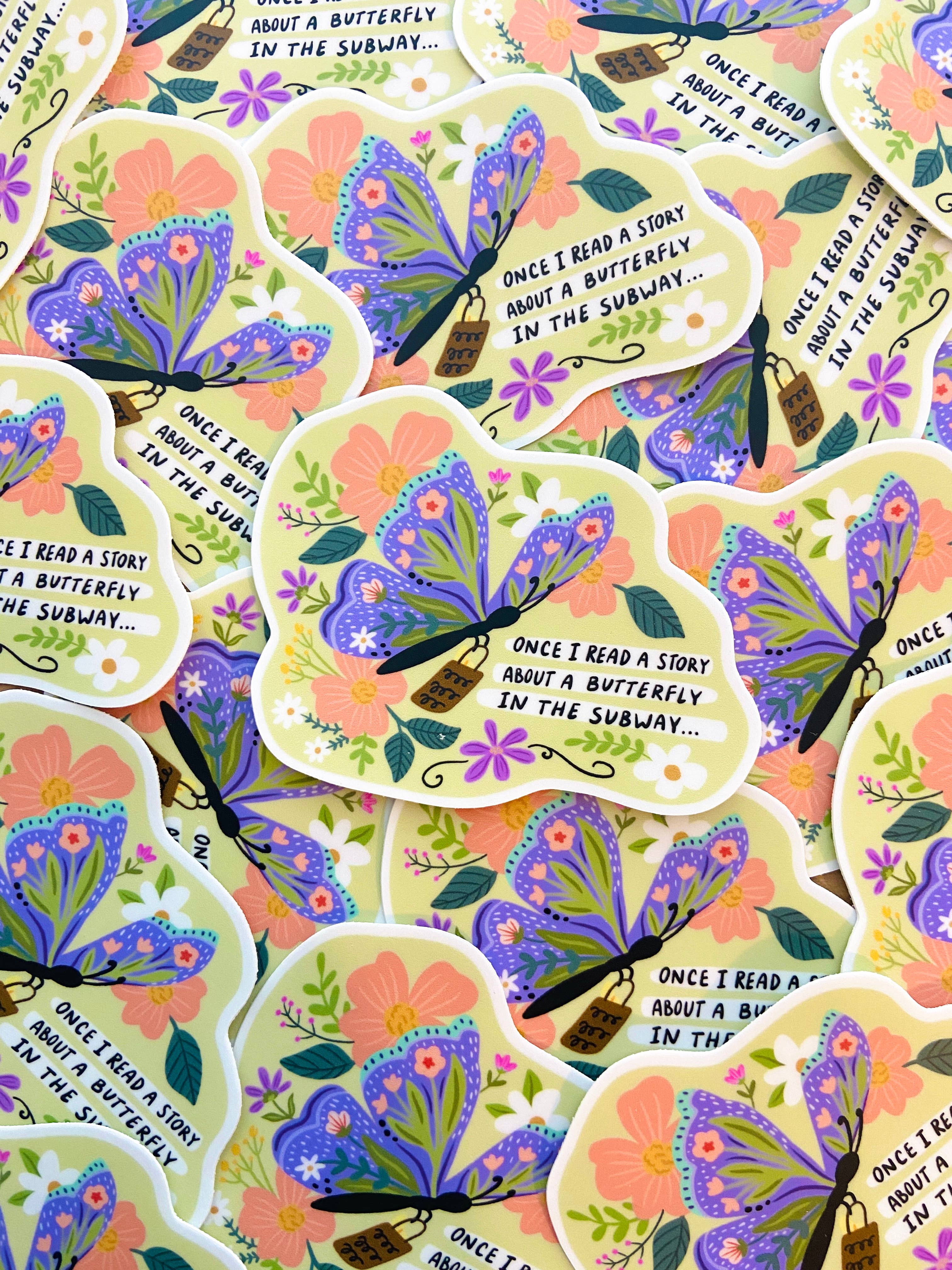 Introducing our introducing our springYou've Got Mail inspired butterfly sticker! A delightful piece of art that will brighten up water bottles, laptops, planners, and more! Key Features: High-Quality Vinyl: Crafted from premium thick vinyl material, this sticker is not only visually stunning but also durable, removable, and waterproof. Captivating Design: Digitally illustrated in an autumn book shop theme. The quote reads: "Once I read a story about a butterfly in the subway..." Perfect Gift Item: Unique and thoughtful gift accessory item, perfect for book stores and boutiques. Dimensions: approx 3 x 2.75 inches/sticker is large, see photo reference