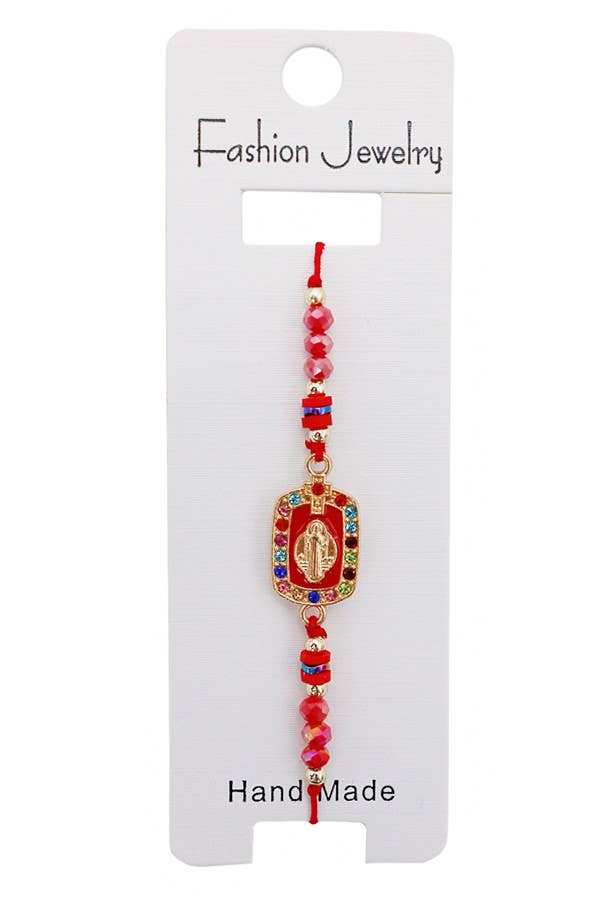 This rosary bracelet has 6mm red crystal beads with Aurora Borealis effect, silver finish links and a red enameled charm with a Holy Spirit image in the front and Holy Family image in the back. Bracelet is adjustable, will fit 6 3/4" - 8" wrist. Makes a great Confirmation gift. Made in Italy.